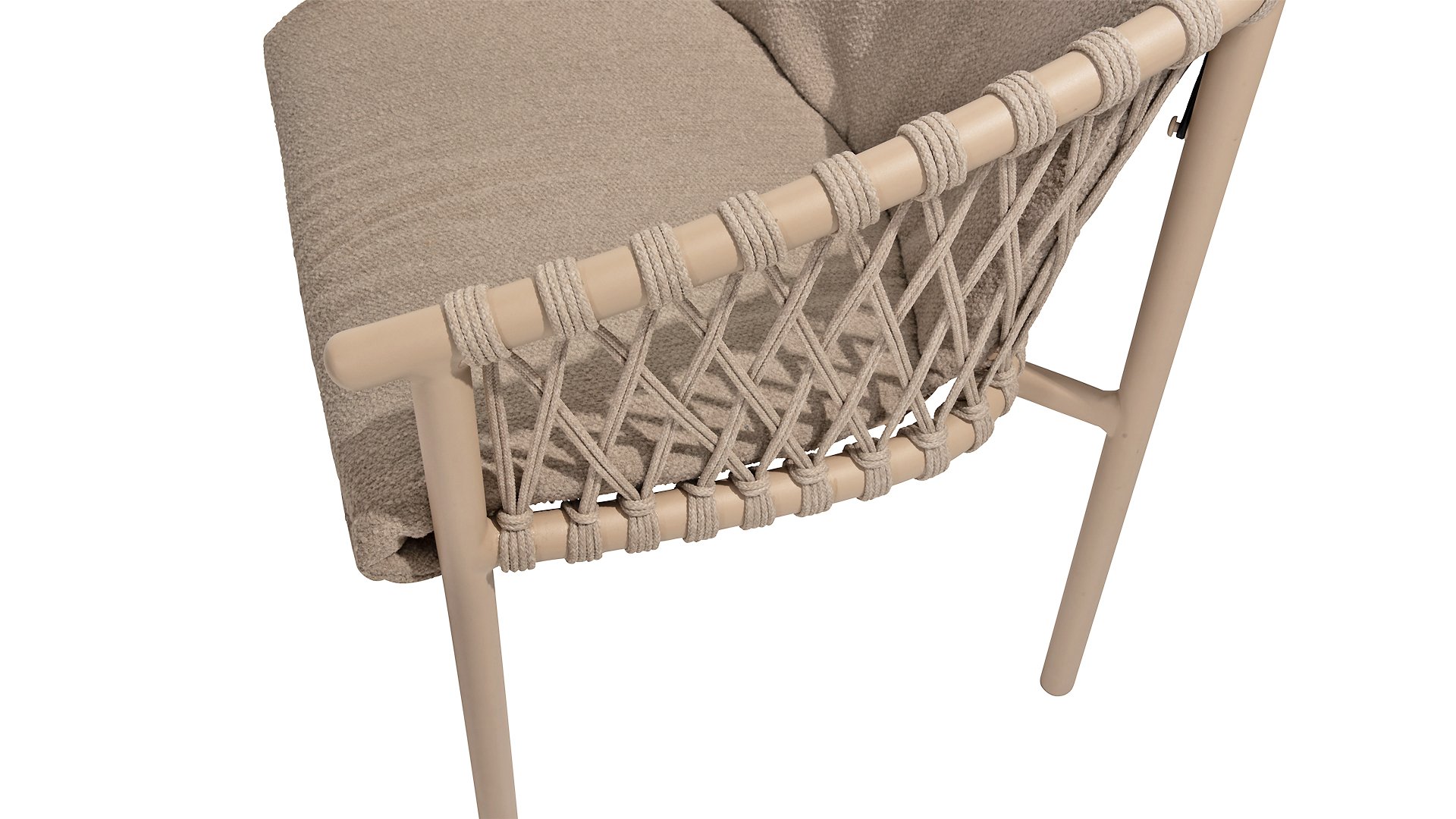 Der Sitzbezug besteht aus Olefin, einem synthetischen Material, das für seine Festigkeit und Wetterbeständigkeit bekannt ist. Die Bouclé Clay-Polsterung verleiht eine luxuriöse und weiche Textur, die sowohl ästhetisch ansprechend als auch praktisch ist.