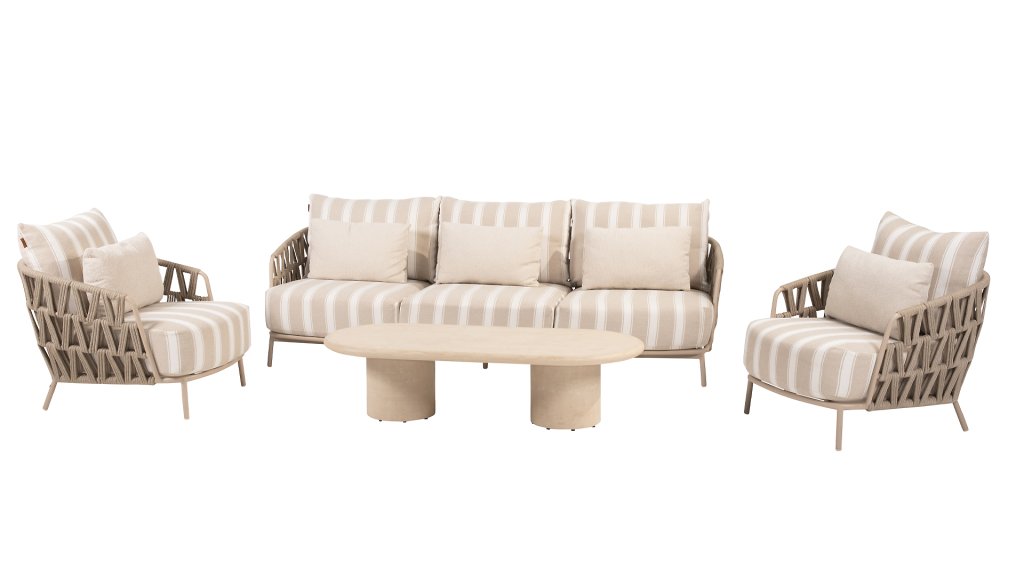 Der Rahmen besteht aus robustem, pulverbeschichtetem Aluminium in einem warmen Sandton und ist mit handgeflochtenem Rope in einem eleganten Muster versehen. Die dicken Kissen bieten nicht nur eine luxuriöse Optik, sondern auch hervorragenden Sitzkomfort. Die Olefin-Kissenbezüge sind wetterfest, farbecht und schnelltrocknend – ideal für das deutsche Klima.