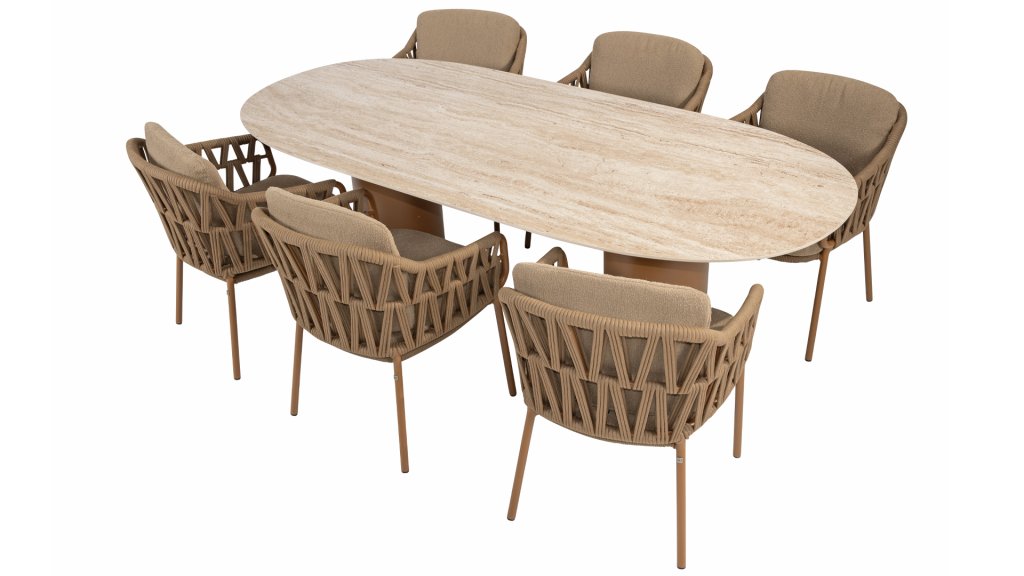 Der robuste Rahmen besteht aus pulverbeschichtetem Aluminium in einem warmen Erdton, kombiniert mit einem auffallend dicken Seilgeflecht. Diese handwerkliche Verarbeitung verleiht der Biarritz-Serie ein robustes und zugleich edles Aussehen. Die wetterbeständigen Olefin-Kissenbezüge sind UV- und schimmelresistent – ideal für jahrelangen Einsatz im Freien.