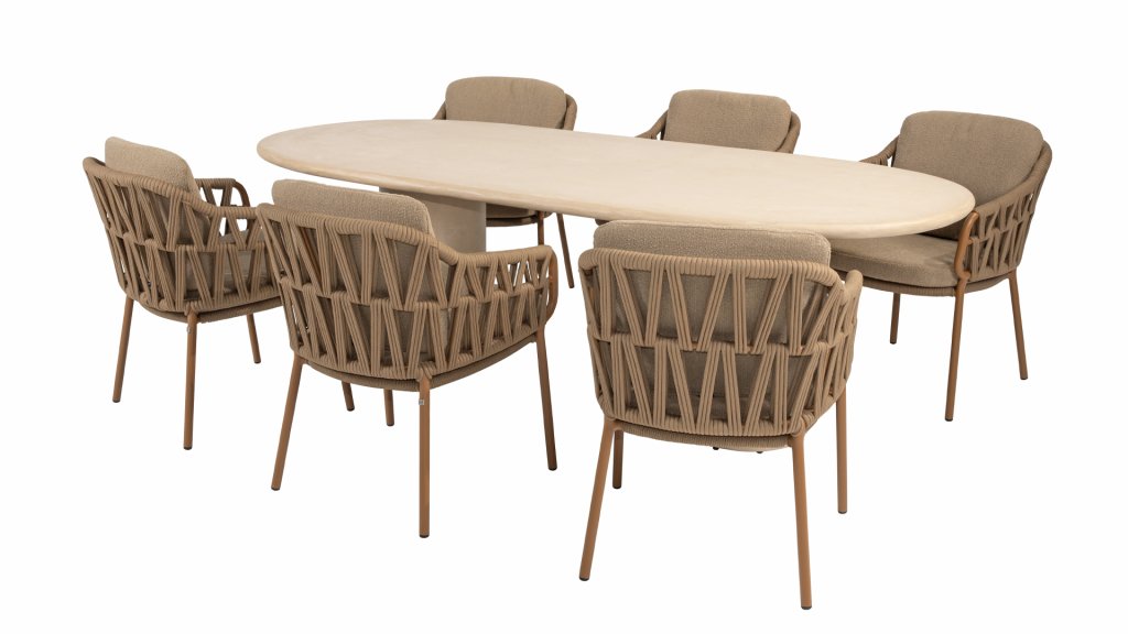 Der robuste Rahmen besteht aus pulverbeschichtetem Aluminium in einem warmen Erdton, kombiniert mit einem auffallend dicken Seilgeflecht. Diese handwerkliche Verarbeitung verleiht der Biarritz-Serie ein robustes und zugleich edles Aussehen. Die wetterbeständigen Olefin-Kissenbezüge sind UV- und schimmelresistent – ideal für jahrelangen Einsatz im Freien.