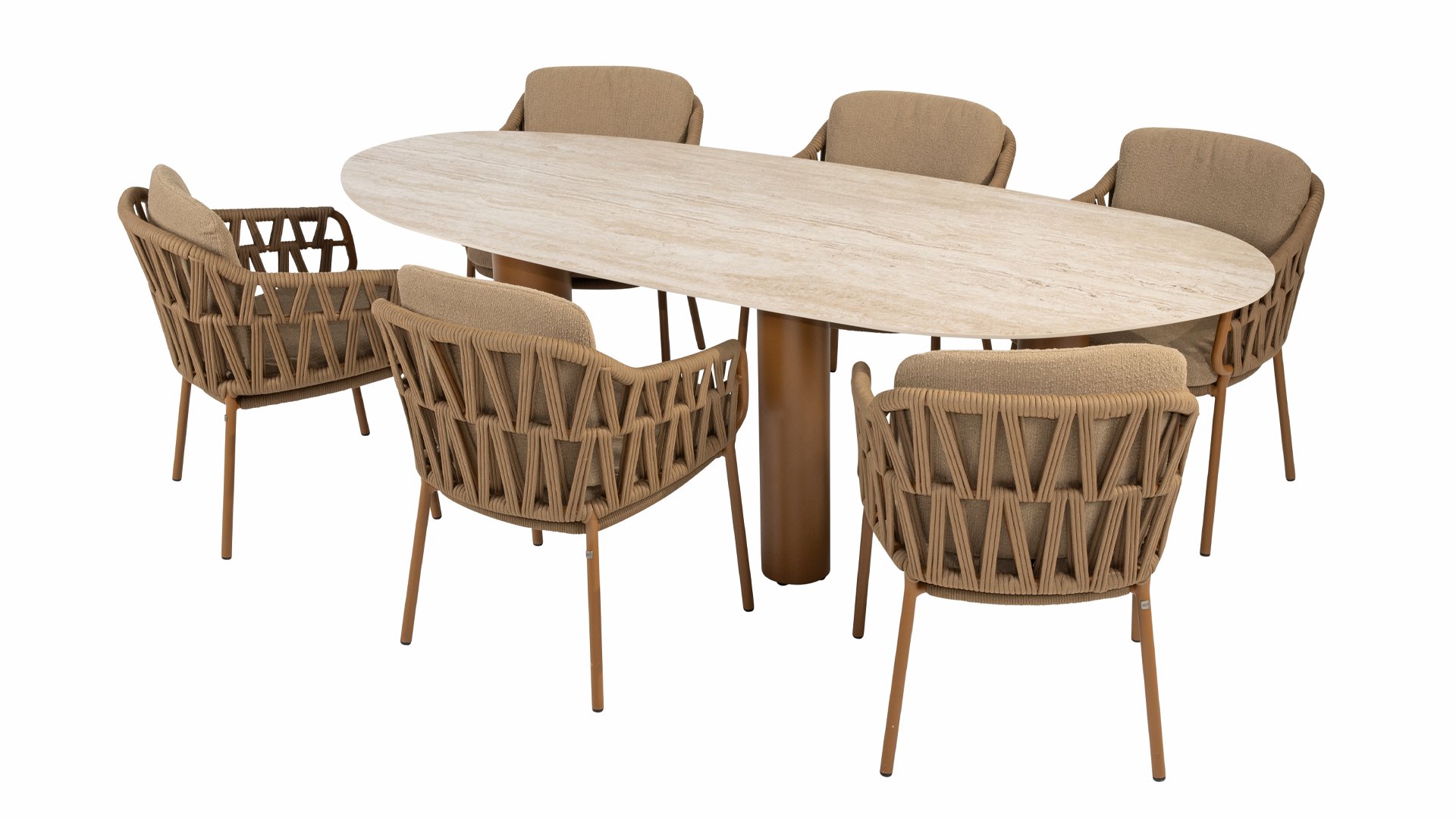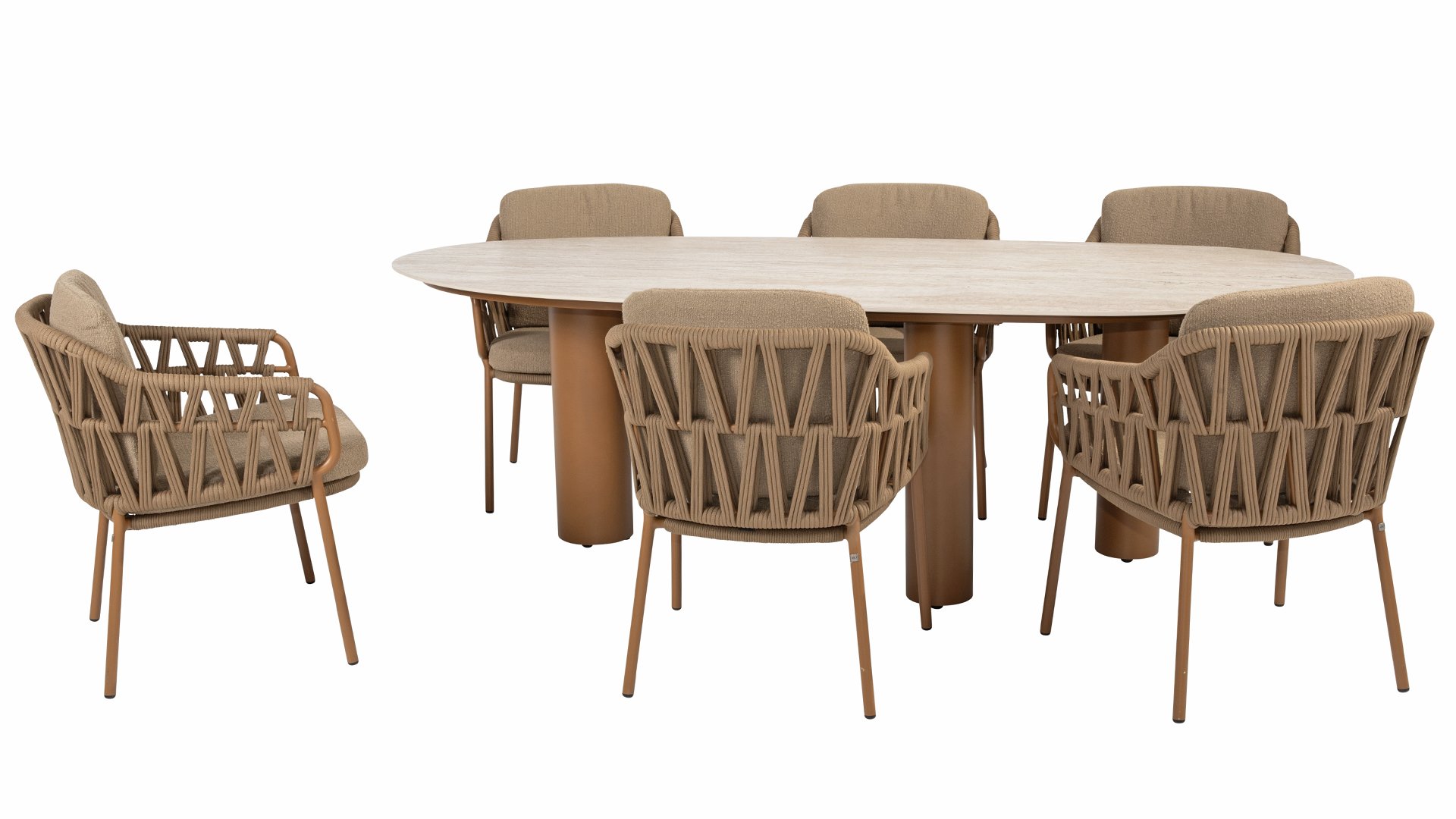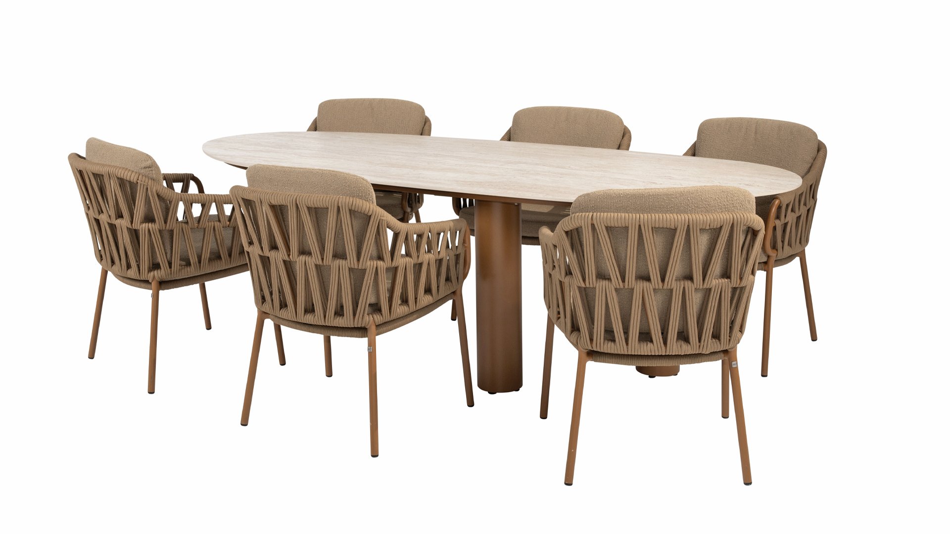 Der robuste Rahmen besteht aus pulverbeschichtetem Aluminium in einem warmen Erdton, kombiniert mit einem auffallend dicken Seilgeflecht. Diese handwerkliche Verarbeitung verleiht der Biarritz-Serie ein robustes und zugleich edles Aussehen. Die wetterbeständigen Olefin-Kissenbezüge sind UV- und schimmelresistent – ​​ideal für jahrelangen Einsatz im Freien.