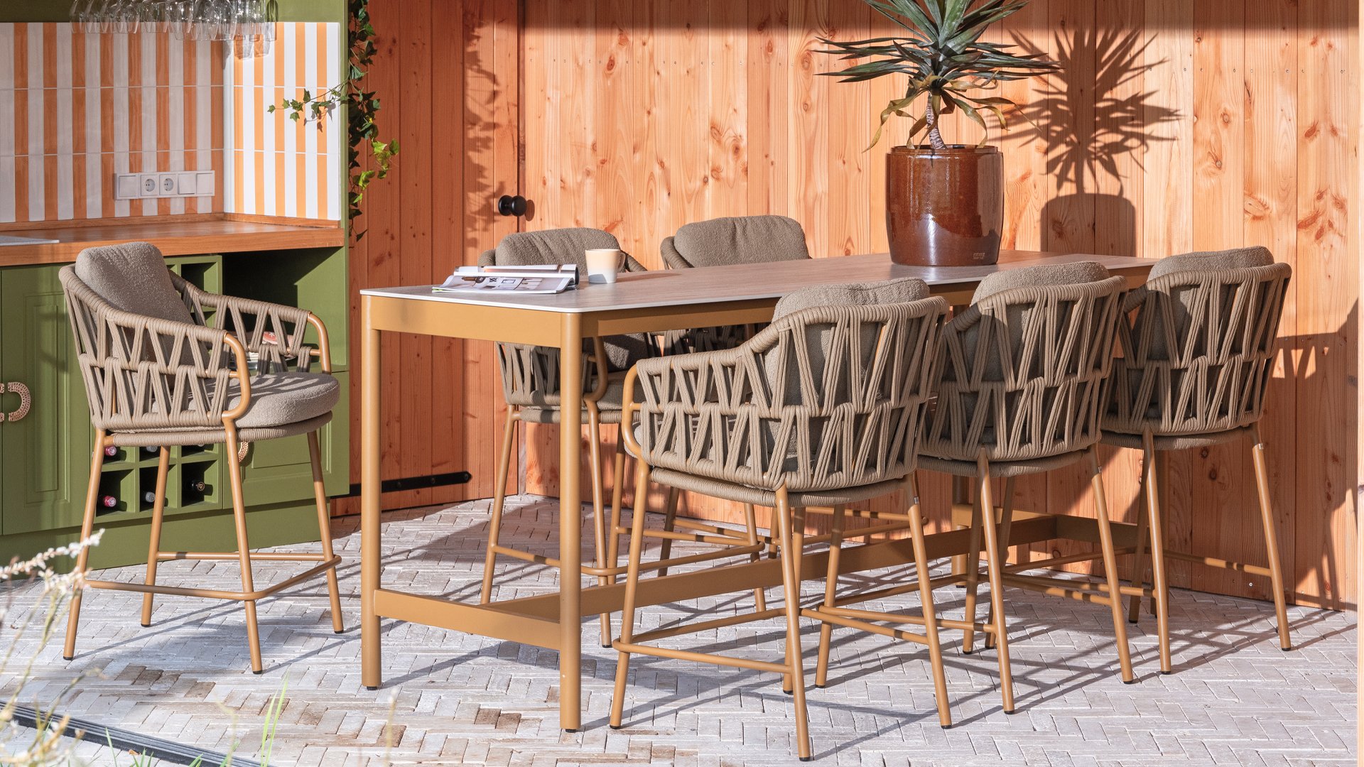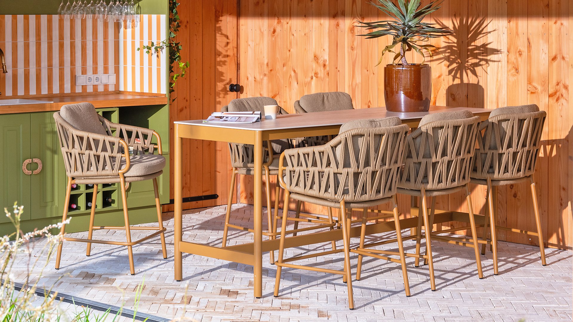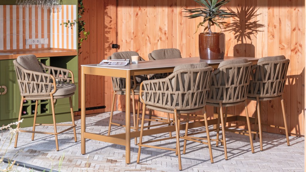 Der 4 Seasons Outdoor Biarritz Amber High Dining ist die perfekte Wahl, wenn Sie einen Stuhl zwischen Barstuhl und Gartenstuhl suchen. Mit seinen großzügig gewebten Seildetails in tiefem Bernstein und den üppig gefüllten Kissen aus weichem, bernsteinfarbenem Bouclé-Stoff lädt dieses Set zum Entspannen in Ihrem Garten oder auf Ihrer Terrasse ein.