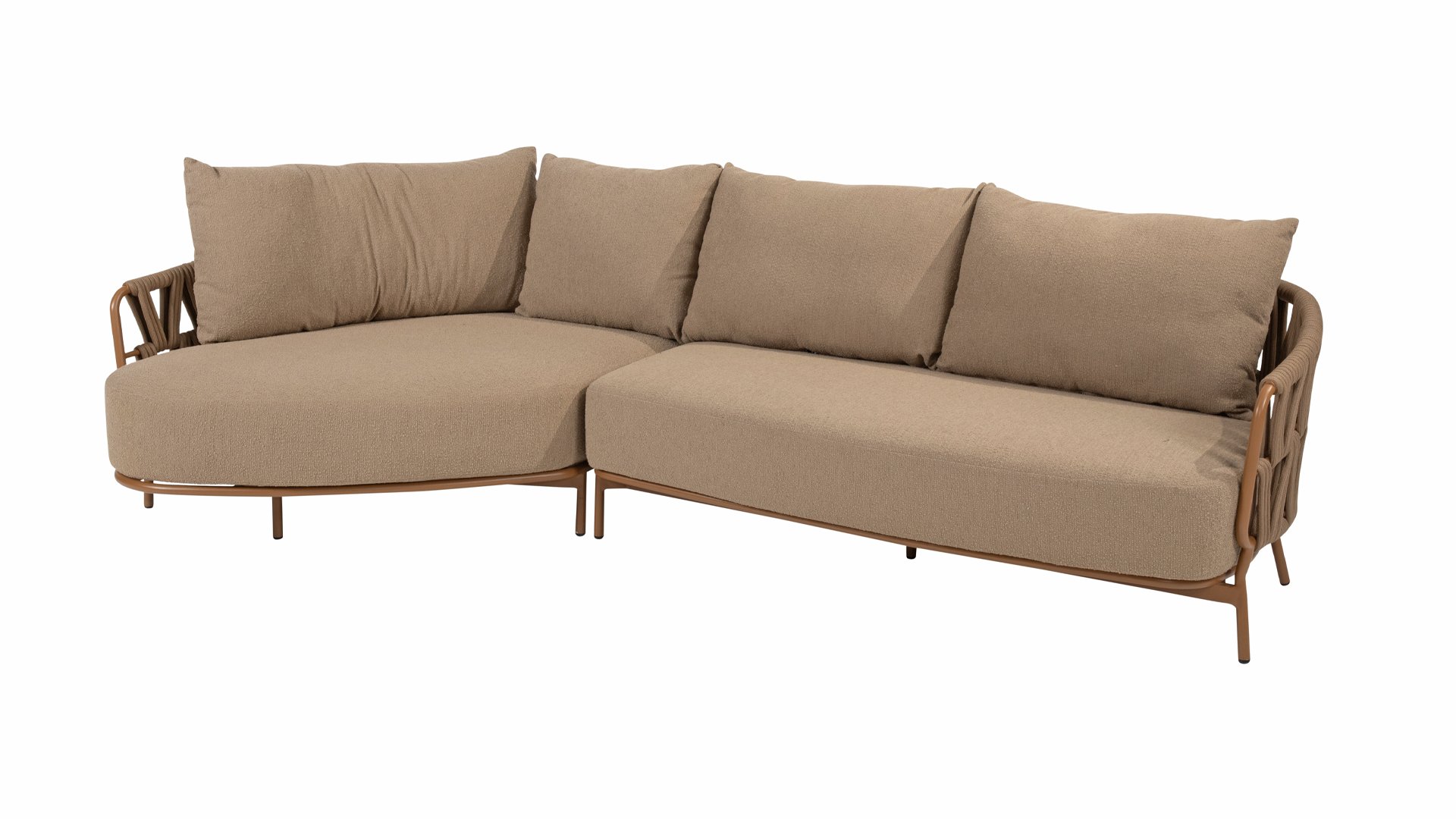 Der robuste Rahmen besteht aus pulverbeschichtetem Aluminium in einem warmen Erdton, kombiniert mit einem auffallend dicken Seilgeflecht. Diese handwerkliche Verarbeitung verleiht der Biarritz -Serie ein robustes und zugleich edles Aussehen. Die geräumigen Sitzflächen, die prallen Kissen und die weichen Texturen machen diese Lounge zu einem luxuriösen Ort für lange Sommertage.