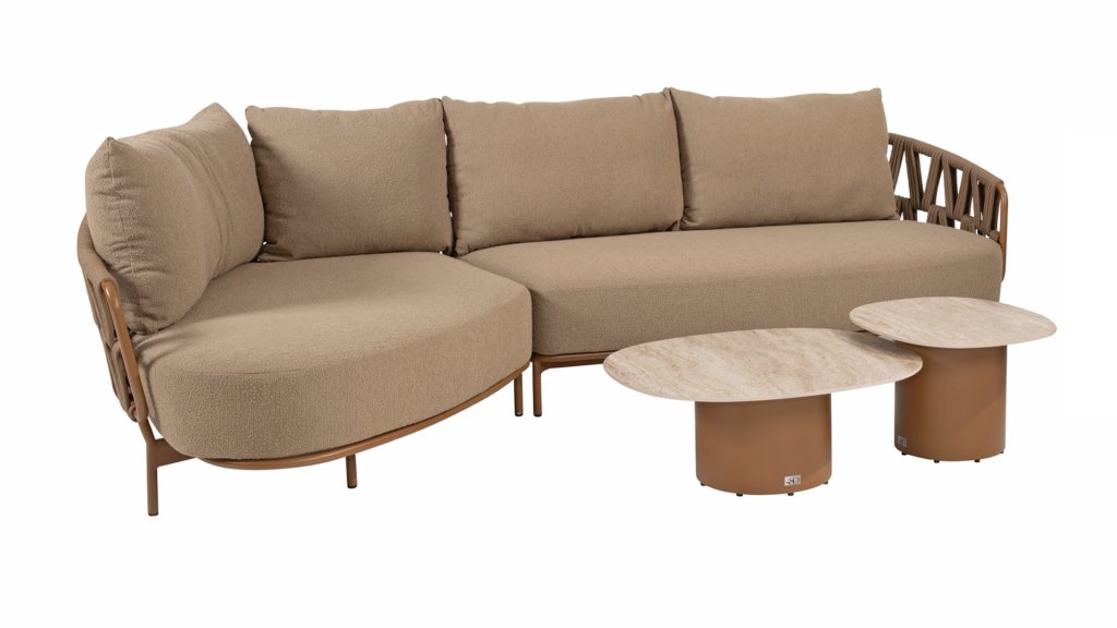 Der robuste Rahmen besteht aus pulverbeschichtetem Aluminium in einem warmen Erdton, kombiniert mit einem auffallend dicken Seilgeflecht. Diese handwerkliche Verarbeitung verleiht der Biarritz -Serie ein robustes und zugleich edles Aussehen. Die geräumigen Sitzflächen, die prallen Kissen und die weichen Texturen machen diese Lounge zu einem luxuriösen Ort für lange Sommertage.