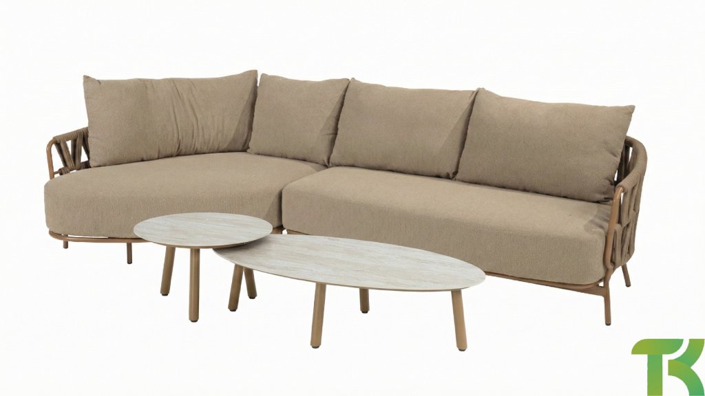 Der robuste Rahmen besteht aus pulverbeschichtetem Aluminium in einem warmen Erdton, kombiniert mit einem auffallend dicken Seilgeflecht. Diese handwerkliche Verarbeitung verleiht der Biarritz -Serie ein robustes und zugleich edles Aussehen. Die geräumigen Sitzflächen, die prallen Kissen und die weichen Texturen machen diese Lounge zu einem luxuriösen Ort für lange Sommertage.