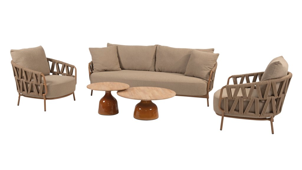 Der robuste Rahmen besteht aus pulverbeschichtetem Aluminium in einem warmen Erdton, kombiniert mit einem auffallend dicken Seilgeflecht. Diese handwerkliche Verarbeitung verleiht der Biarritz -Serie ein robustes und zugleich edles Aussehen. Die geräumigen Sitzflächen, die prallen Kissen und die weichen Texturen machen diese Lounge zu einem luxuriösen Ort für lange Sommertage.
