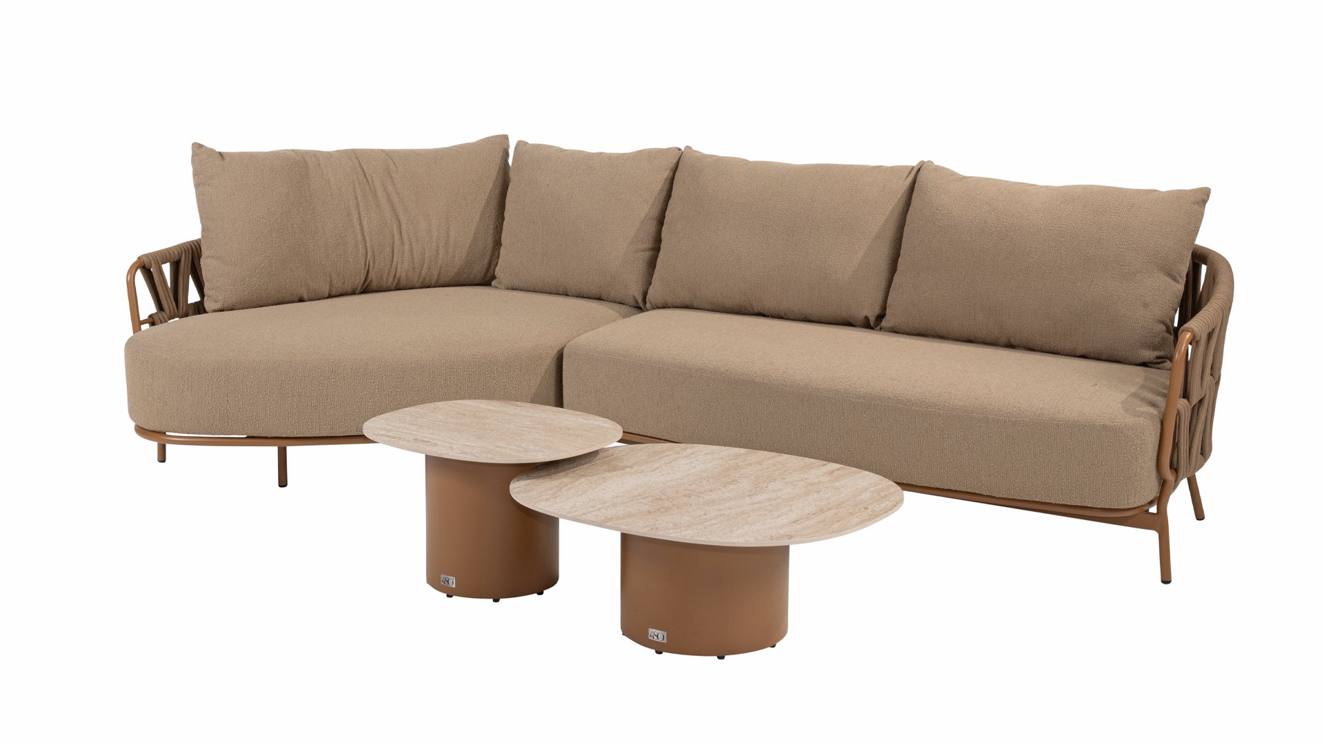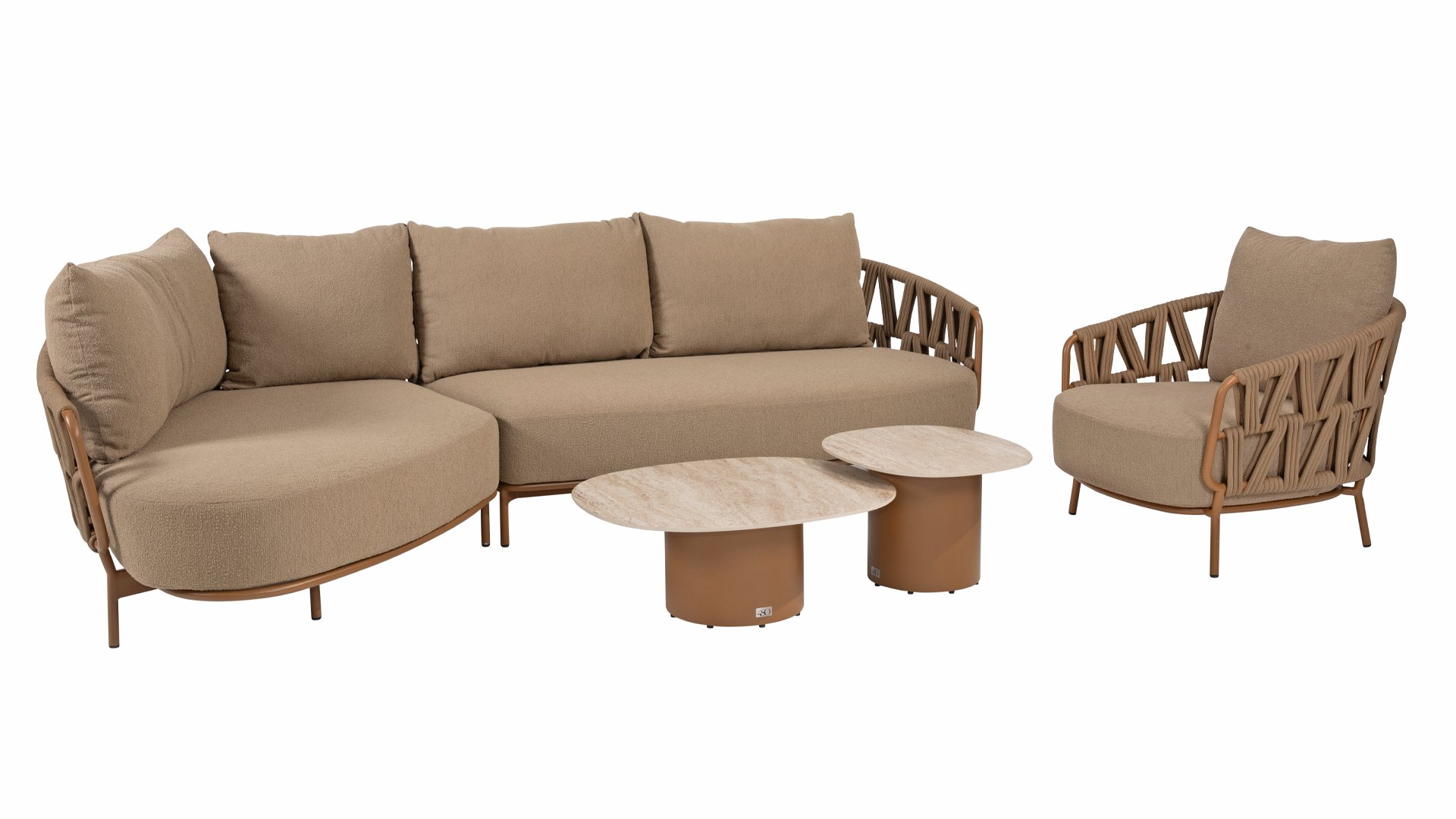 Der robuste Rahmen besteht aus pulverbeschichtetem Aluminium in einem warmen Erdton, kombiniert mit einem auffallend dicken Seilgeflecht. Diese handwerkliche Verarbeitung verleiht der Biarritz -Serie ein robustes und zugleich edles Aussehen. Die geräumigen Sitzflächen, die prallen Kissen und die weichen Texturen machen diese Lounge zu einem luxuriösen Ort für lange Sommertage.
