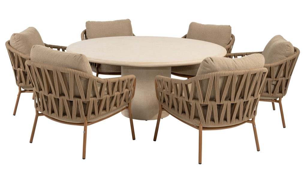 Der Hampton ist aus hochwertigem Mortex gefertigt, einem langlebigen und wasserfesten Material, das für seine natürliche Optik und außergewöhnliche Wetterbeständigkeit bekannt ist. Jede Tischplatte wird von Hand bearbeitet und schafft so einen einzigartigen, warmen Look, der sowohl moderne als auch mediterrane Gärten perfekt ergänzt.