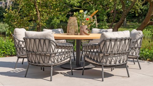 Der niedrige Esstisch 4Seasons Saba hat einen pulverbeschichteten Edelstahlfuß mit einer Tischplatte aus Teakholz. Wir empfehlen die Pflege des Teakholzes mit unseren Pflegeprodukten von 4 Seasons Outdoor, um eine lange Lebensdauer und ein schönes Aussehen zu garantieren. Der Calpi-Stuhl besteht aus einer Edelstahlbasis mit Seilteilen, die gegen verschiedene Witterungseinflüsse beständig sind.