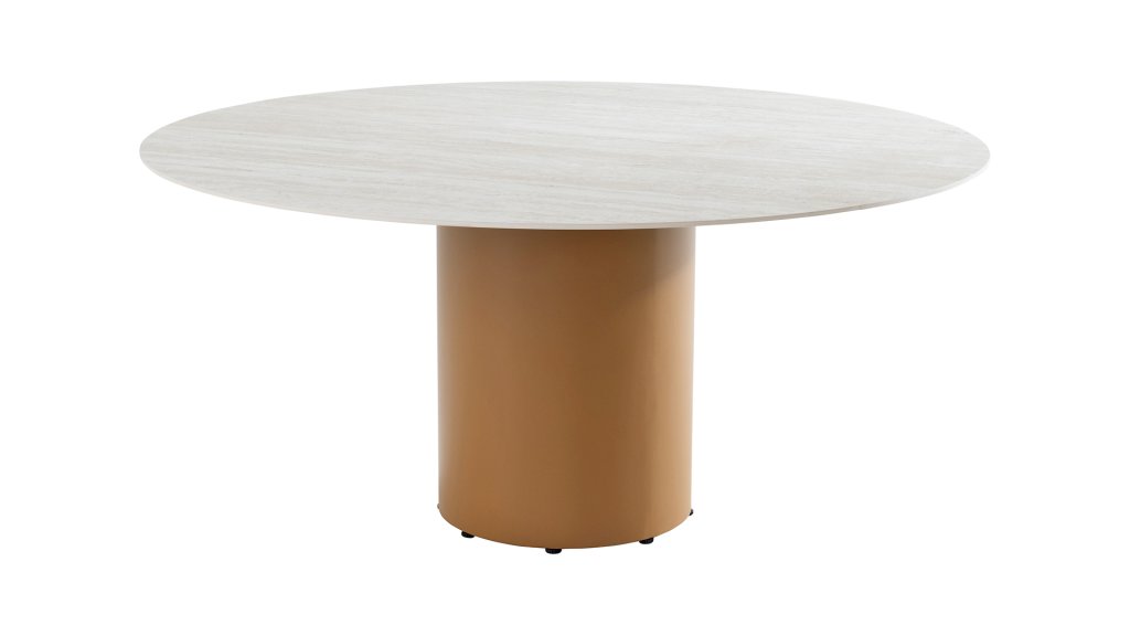 Ein wunderschöner, eleganter Tisch mit einer atemberaubenden runden Keramikplatte. Der Tisch misst Ø160 cm und eignet sich perfekt für gesellige Runden oder Familienessen. Die Keramikplatte sieht nicht nur elegant aus, sondern ist auch robust und pflegeleicht – ideal für den täglichen Gebrauch.