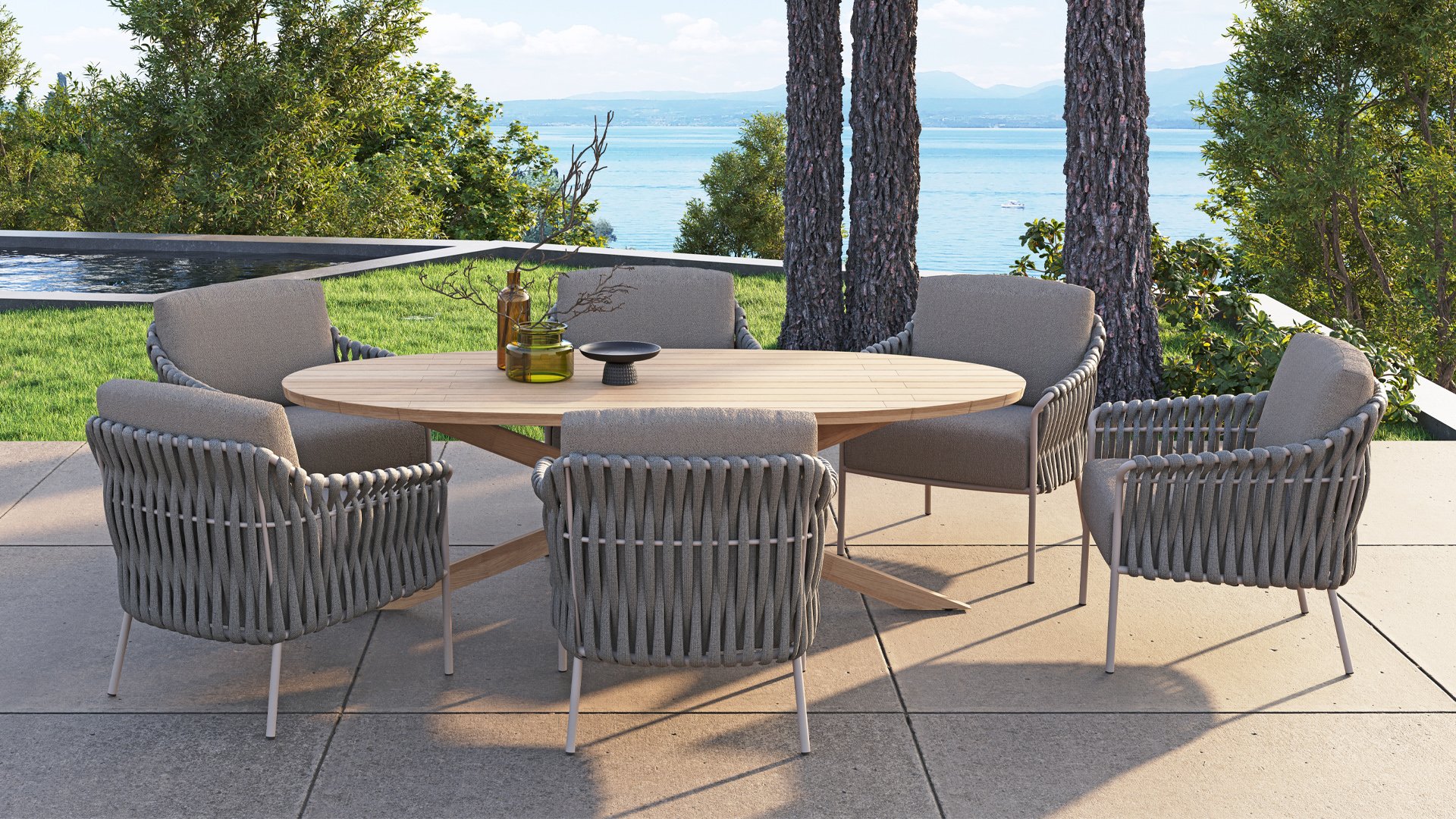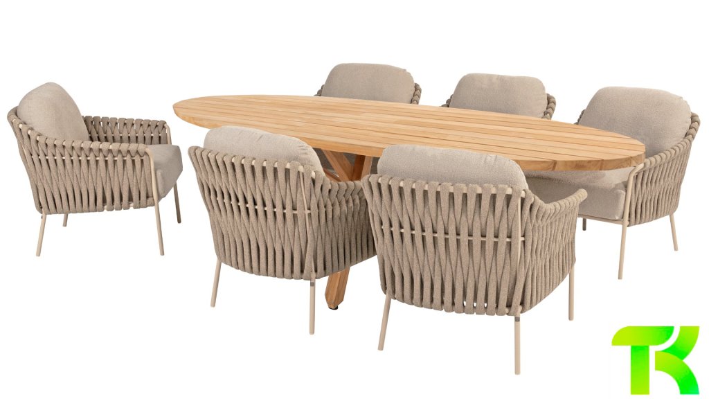 Die Taste by 4Seasons Prado Ellipse kann getrost als Kunstwerk bezeichnet werden. Schauen Sie sich an, wie kunstvoll dieses Beinset zusammengestellt ist. Die dicke Teakplatte hat eine abgeschrägte Seite und verleiht dem Tisch etwas Luftiges