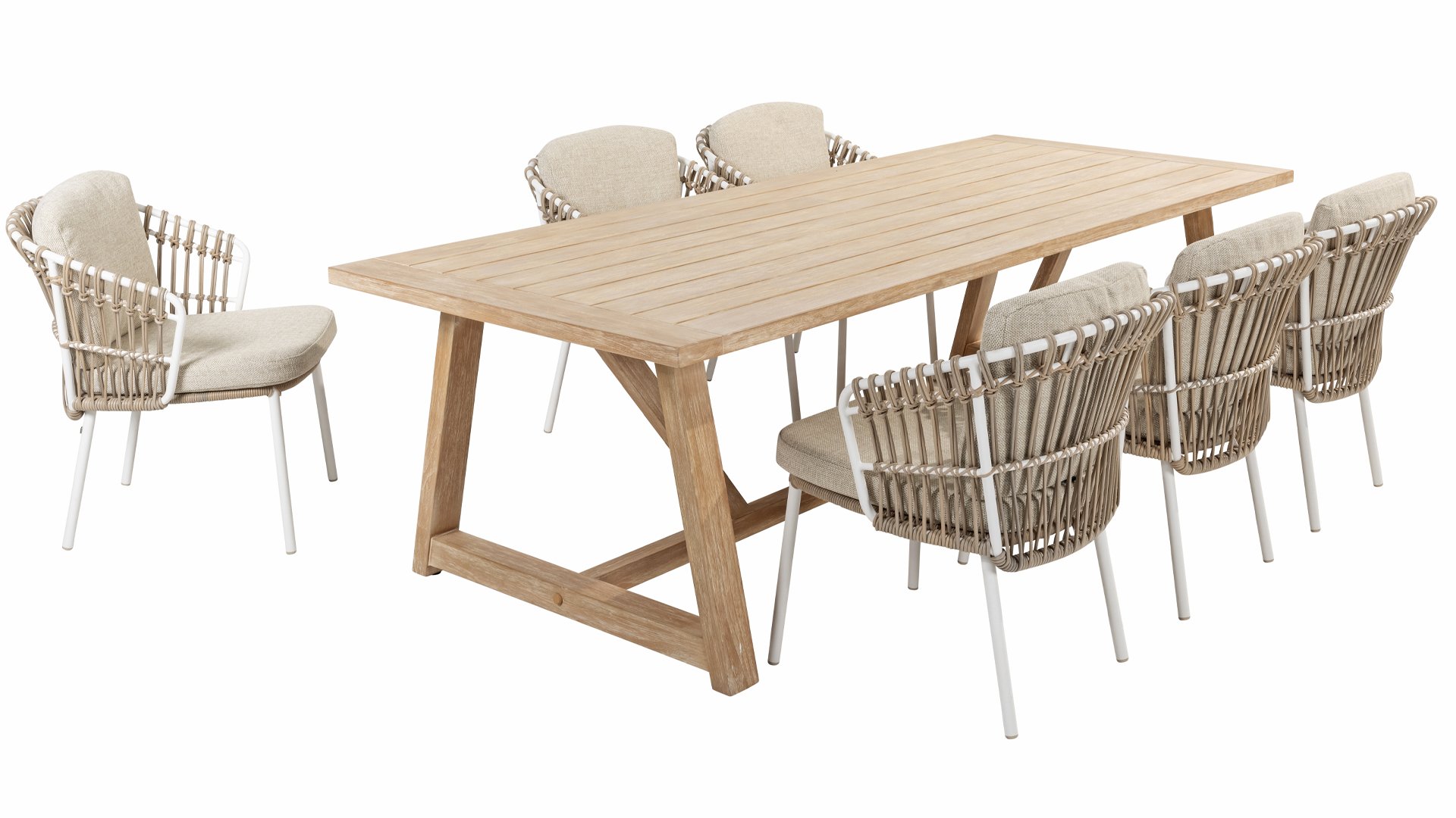 Weiße Dalias am Strand. Schließen Sie die Augen und stellen Sie sich vor, Sie wären auf Ibiza. Die sommerliche Atmosphäre, die die 4 Seasons Outdoor Dalias Gartenmöbelset Serie durch das weiße Gestell und das taupefarbene Korbgeflecht versprüht, verleiht Ihrem Garten sofort einen sonnigen Kick. Wenn Sie den Sommer mögen, werden Sie Dalias lieben.