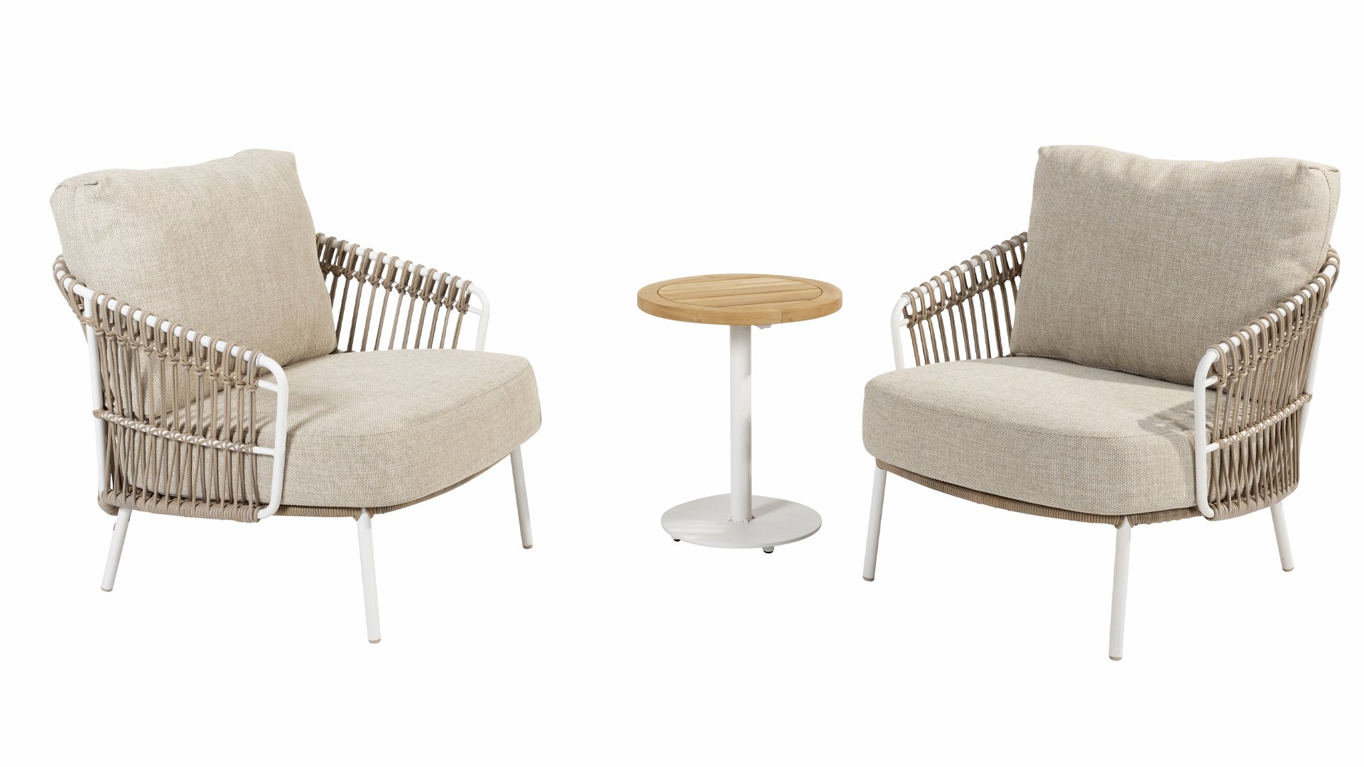 Weiße Dalias am Strand. Schließen Sie die Augen und stellen Sie sich vor, Sie wären auf Ibiza. Die sommerliche Atmosphäre, die die Dalias-Serie durch das weiße Gestell und das taupefarbene Korbgeflecht versprüht, verleiht Ihrem Garten sofort einen sonnigen Kick. Wenn Sie den Sommer mögen, werden Sie Dalias lieben.