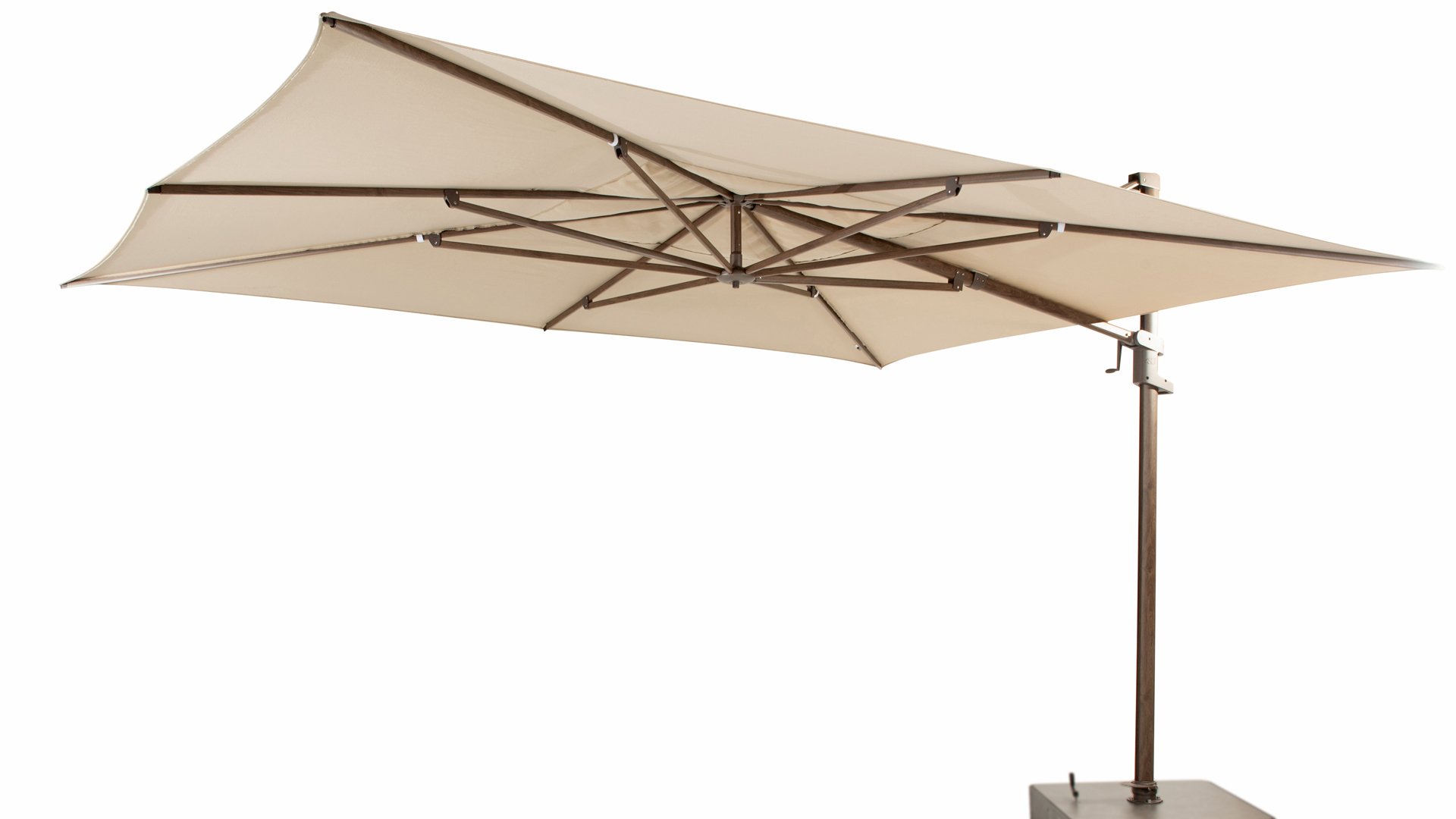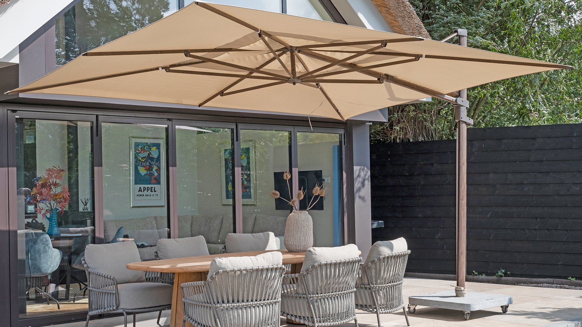 Der 4Seasons-Hängearmschirm ist inzwischen ein echter Klassiker. Dieser Schwebeschirm hat seine Qualität bereits bewiesen. Der Schirm ist nach hinten kippbar, um die tief stehende Sonne abzufangen. Der Schirm ist auch auf dem Sockel drehbar. Weitere Informationen finden Sie im Video. Standardmäßig 5 Jahre Garantie.