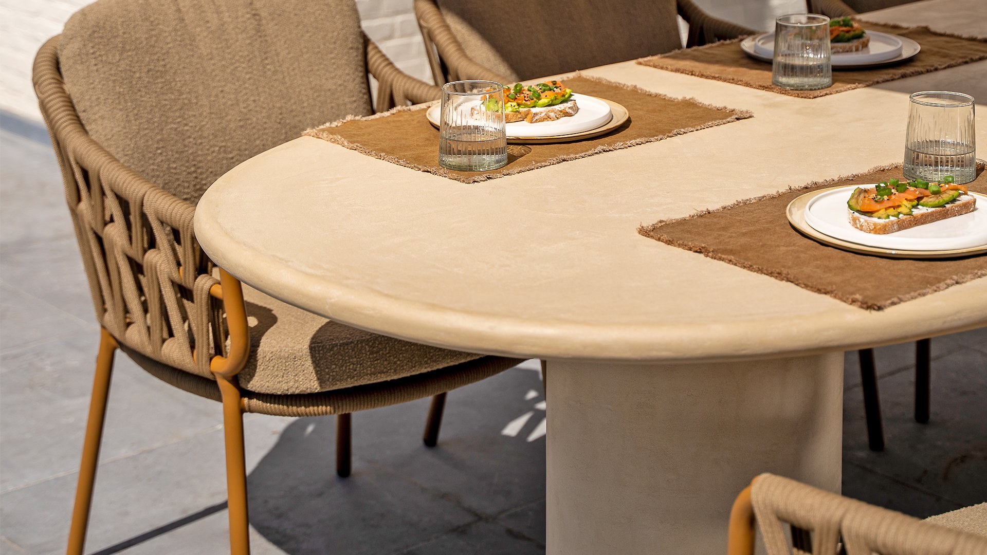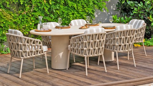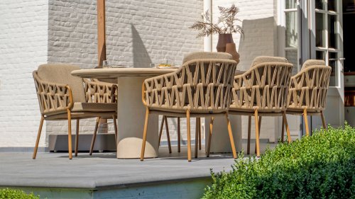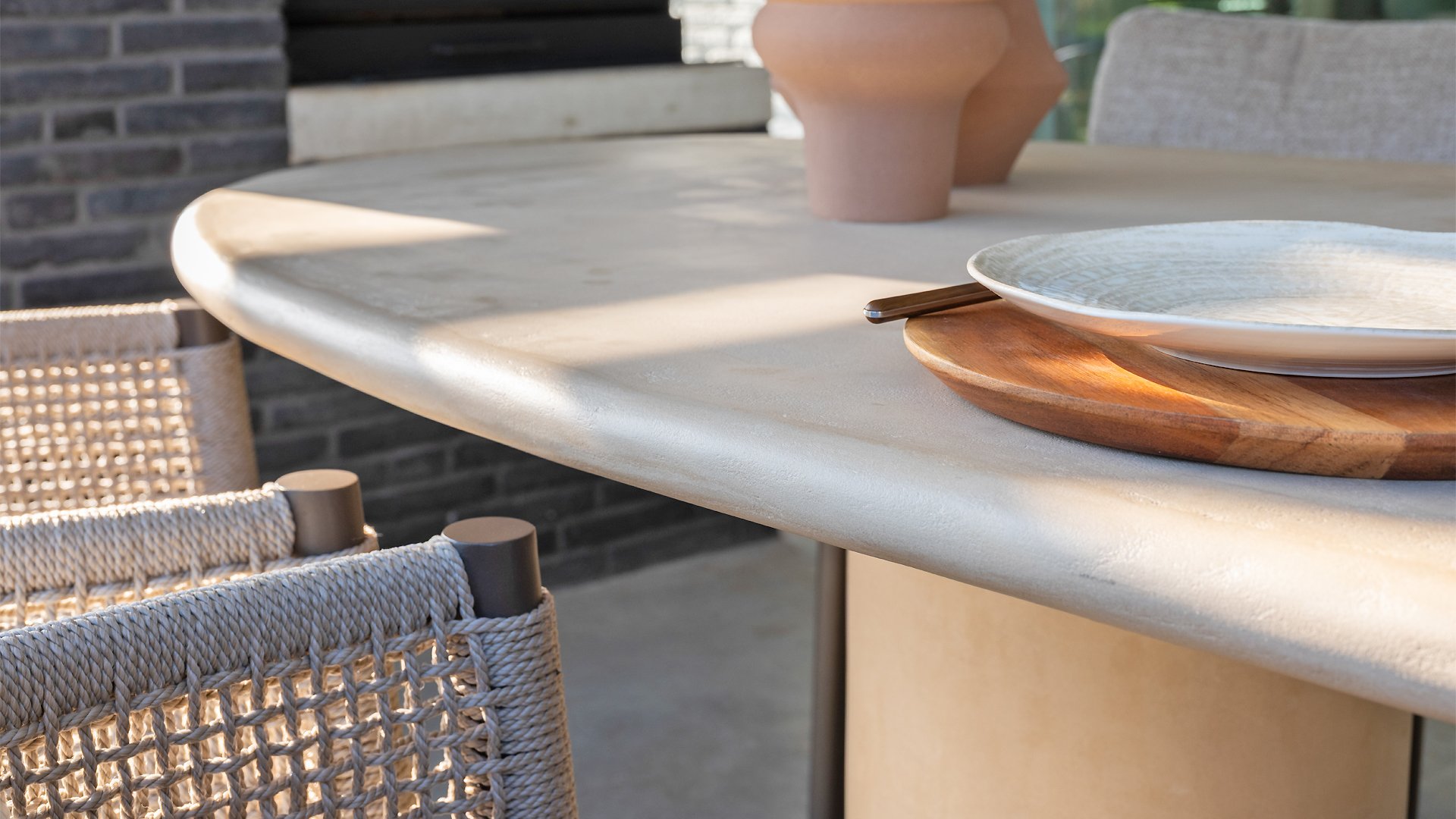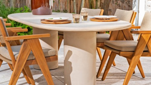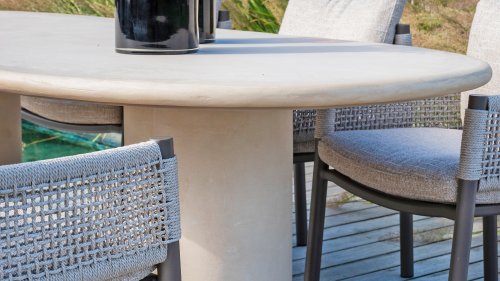 Der Hampton ist aus hochwertigem Mortex gefertigt, einem langlebigen und wasserfesten Material, das für seine natürliche Optik und außergewöhnliche Wetterbeständigkeit bekannt ist. Jede Tischplatte wird von Hand bearbeitet und schafft so einen einzigartigen, warmen Look, der sowohl moderne als auch mediterrane Gärten perfekt ergänzt.