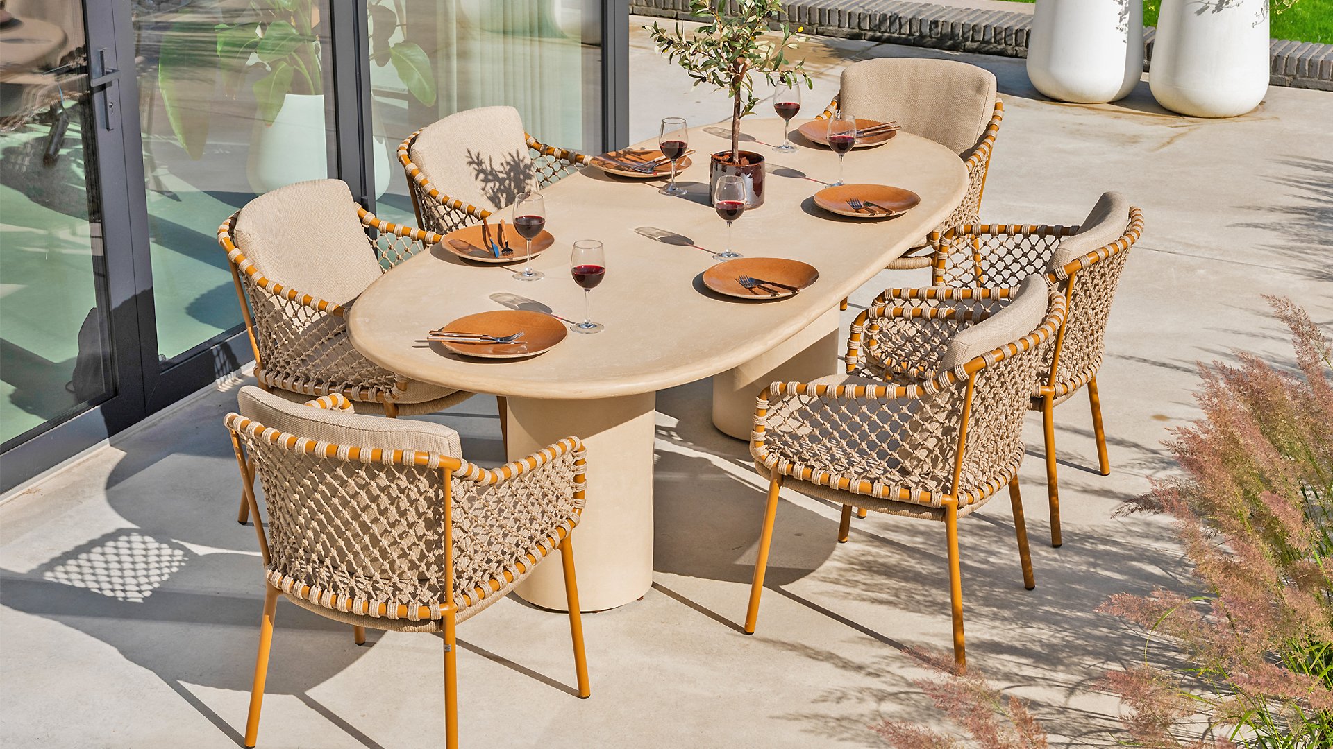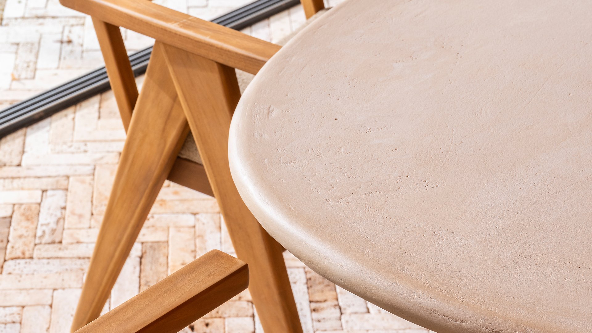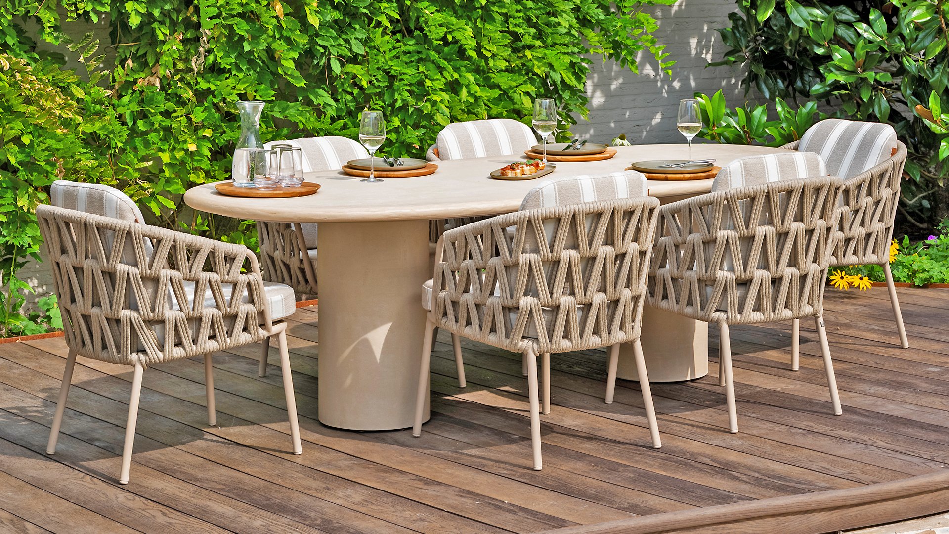 Der Hampton ist aus hochwertigem Mortex gefertigt, einem langlebigen und wasserfesten Material, das für seine natürliche Optik und außergewöhnliche Wetterbeständigkeit bekannt ist. Jede Tischplatte wird von Hand bearbeitet und schafft so einen einzigartigen, warmen Look, der sowohl moderne als auch mediterrane Gärten perfekt ergänzt.