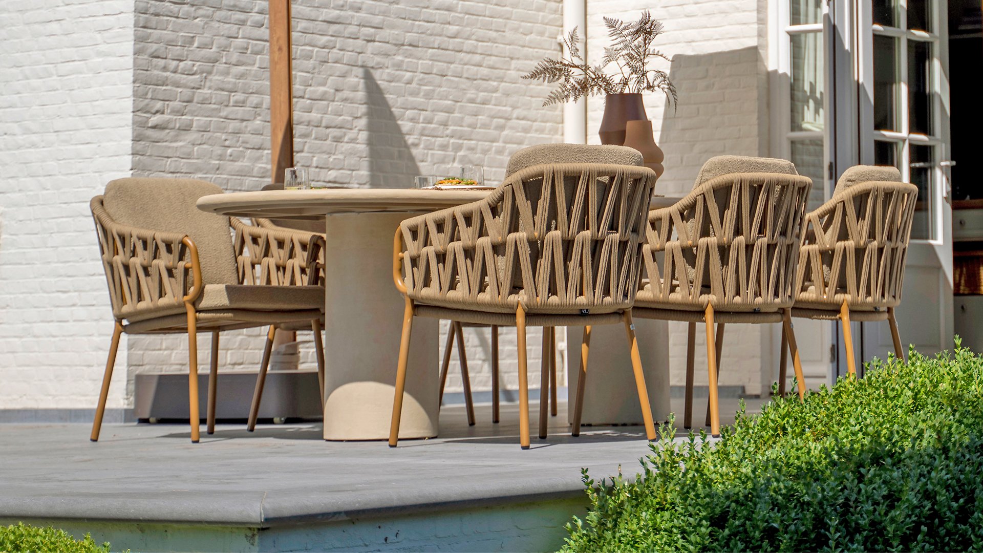 Der Tisch ist in verschiedenen Größen erhältlich, sodass Sie immer den passenden Hampton für Ihren Außenbereich finden. Wählen Sie die runde Version mit Ø160cm für eine gemütliche Atmosphäre mit einem einzelnen, eleganten Mittelbein oder die großzügigen ovalen Versionen mit 240cm oder 300cm. Beide verfügen über zwei schlanke, vertikale Beine, die für Stabilität und ein markantes, geradliniges Design sorgen. Für alle, die ein entspannteres Essen bevorzugen, gibt es auch eine Low-Dining Version Ø160cm, ideal für entspannte Momente im Lounge-Stil.