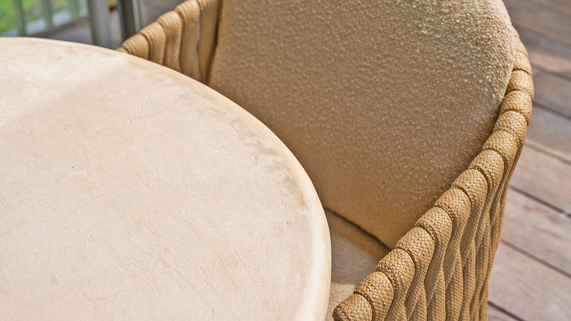 Der Hampton ist aus hochwertigem Mortex gefertigt, einem langlebigen und wasserfesten Material, das für seine natürliche Optik und außergewöhnliche Wetterbeständigkeit bekannt ist. Jede Tischplatte wird von Hand bearbeitet und schafft so einen einzigartigen, warmen Look, der sowohl moderne als auch mediterrane Gärten perfekt ergänzt.