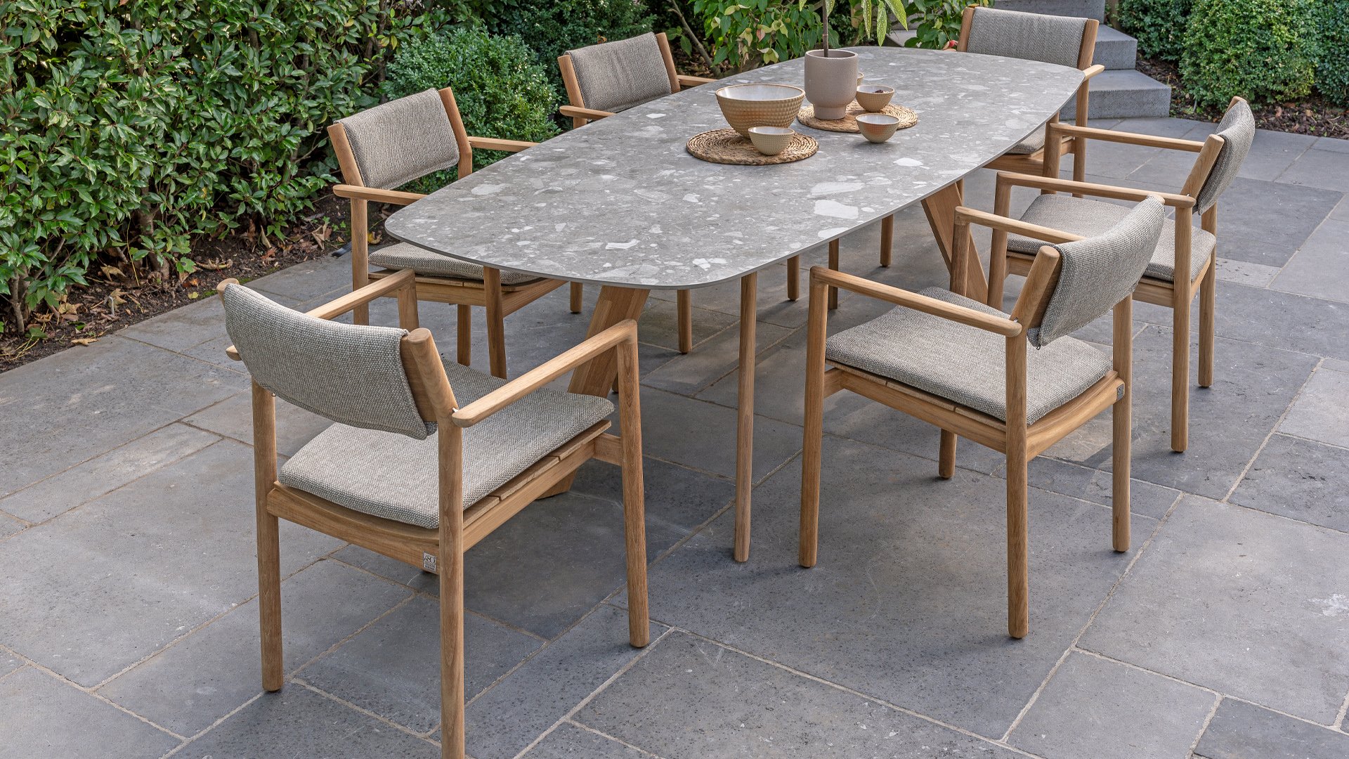 Der 4Seasons Outdoor Montana ist ein wunderschöner Tisch, der sofort ins Auge fällt. Es sieht nicht nur modern aus, sondern ist durch die Form der Tischplatte auch äußerst praktisch. Der Tisch zeichnet sich durch seine dänisch-ovale Tischplatte aus, die Form schafft ausreichend Platz auf allen Seiten des Tisches. Bei der Montana-Serie gibt es mehrere Optionen; Die 240 cm hohe Terrazzo-Keramikplatte kann mit einem Untergestell aus Edelstahl oder Teakholz kombiniert werden. Innerhalb der Montana-Serie gibt es auch einen 280 cm großen Tisch mit HPL-Platte.