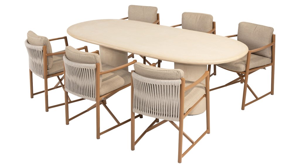Entdecken Sie Hampton: die perfekte Balance zwischen raffinierter Eleganz und robuster Schlichtheit. Dieser wunderschöne Gartentisch in stilvollem Beige/Weiß strahlt Ruhe und Luxus aus und ist das Herzstück jedes Außenbereichs – vom gemütlichen Abendessen bis zum langen Sommerabend mit Freunden und Familie. Der Hampton ist aus hochwertigem Mortex gefertigt, einem langlebigen und wasserfesten Material, das für seine natürliche Optik und außergewöhnliche Wetterbeständigkeit bekannt ist. Jede Tischplatte wird von Hand bearbeitet und schafft so einen einzigartigen, warmen Look, der sowohl moderne als auch mediterrane Gärten perfekt ergänzt. Der Tisch ist in verschiedenen Größen erhältlich, sodass Sie immer den passenden Hampton für Ihren Außenbereich finden. Wählen Sie die runde Version mit Ø160cm für eine gemütliche Atmosphäre mit einem einzelnen, eleganten Mittelbein oder die großzügigen ovalen Versionen mit 240cm oder 300cm. Beide verfügen über zwei schlanke, vertikale Beine, die für Stabilität und ein markantes, geradliniges Design sorgen. Für alle, die ein entspannteres Essen bevorzugen, gibt es auch eine Low-Dining Version Ø160cm, ideal für entspannte Momente im Lounge-Stil.