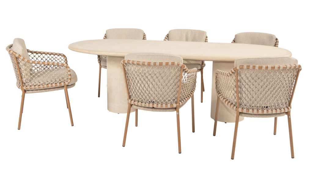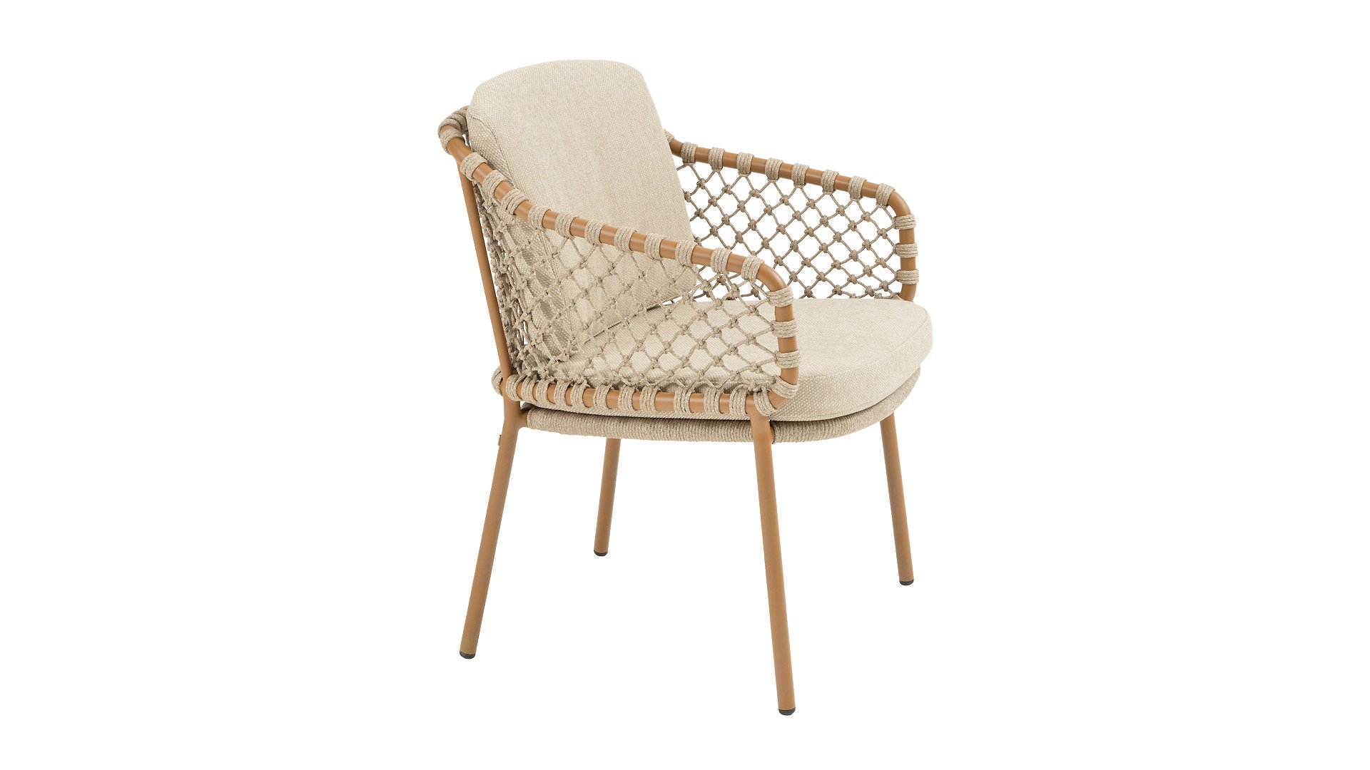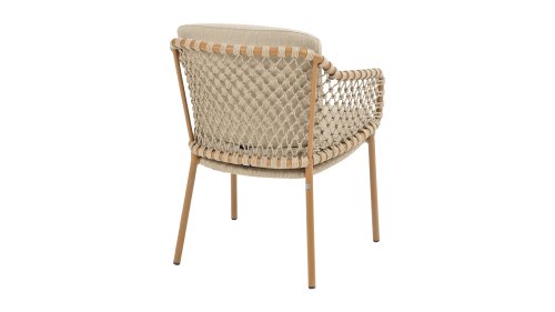 Mit einer eleganten und luftigen geflochtenen Seilstruktur in einem warmen Bernsteinton, kombiniert mit einer dezent geschwungenen Rückenlehne. Die Kombination aus offenem Seilgeflecht und natürlichen Farbtönen schafft eine moderne, einladende Atmosphäre. Die weichen sandfarbenen Kissen bieten bequemen Sitzkomfort – ideal für lange Sommerabende am Tisch.