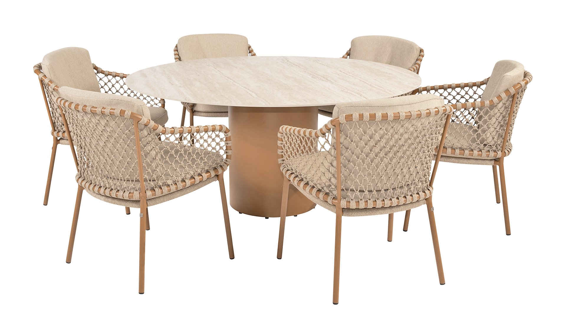 Mit einer eleganten und luftigen geflochtenen Seilstruktur in einem warmen Bernsteinton, kombiniert mit einer dezent geschwungenen Rückenlehne. Die Kombination aus offenem Seilgeflecht und natürlichen Farbtönen schafft eine moderne, einladende Atmosphäre. Die weichen sandfarbenen Kissen bieten bequemen Sitzkomfort – ideal für lange Sommerabende am Tisch.