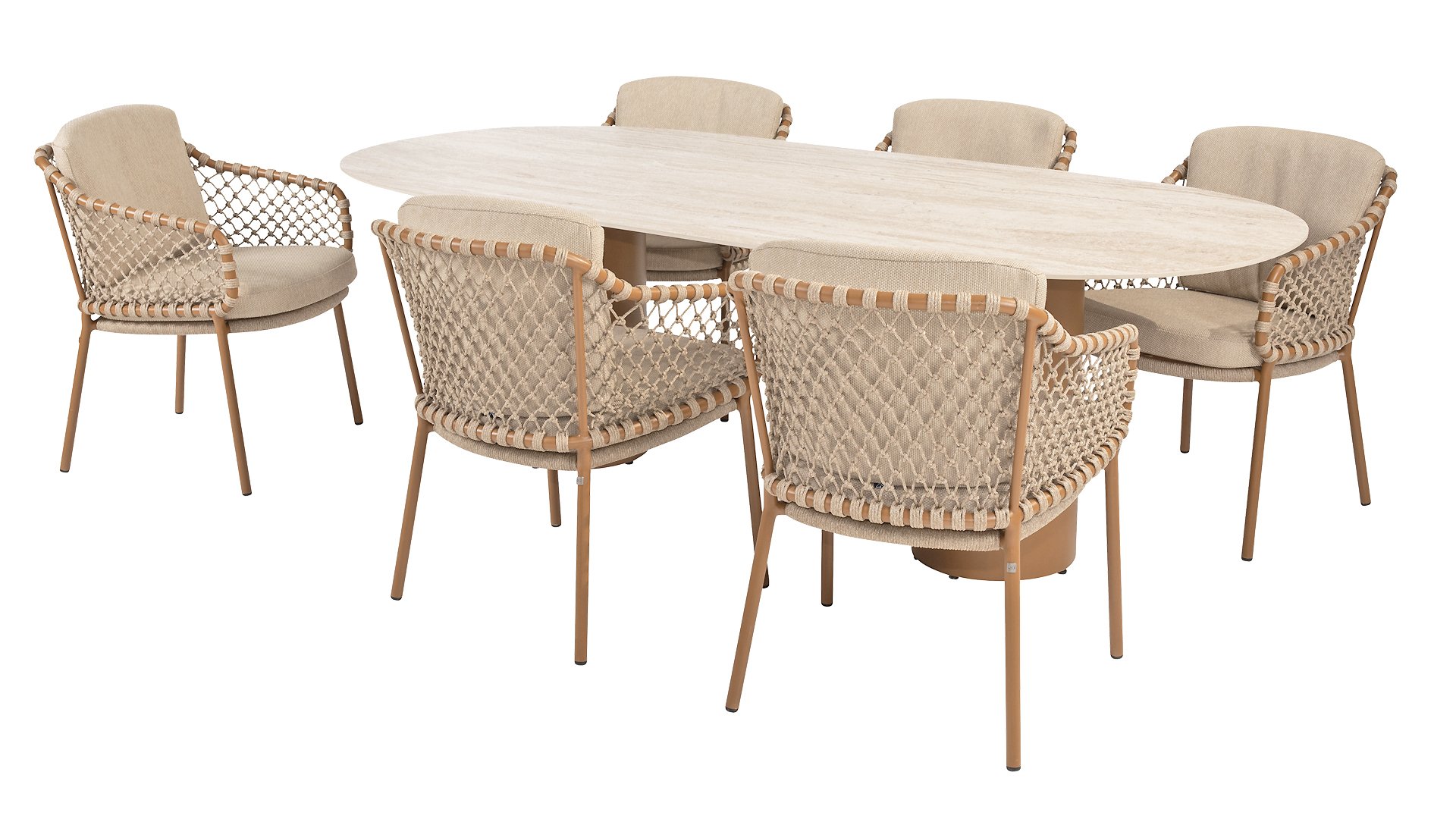 Mit einer eleganten und luftigen geflochtenen Seilstruktur in einem warmen Bernsteinton, kombiniert mit einer dezent geschwungenen Rückenlehne. Die Kombination aus offenem Seilgeflecht und natürlichen Farbtönen schafft eine moderne, einladende Atmosphäre. Die weichen sandfarbenen Kissen bieten bequemen Sitzkomfort – ideal für lange Sommerabende am Tisch.