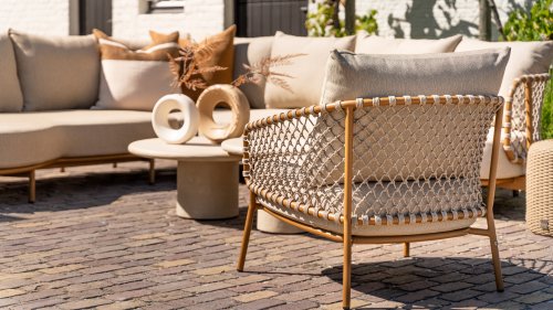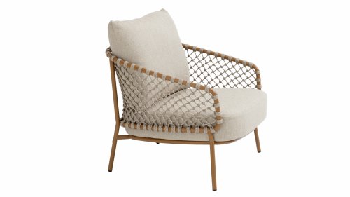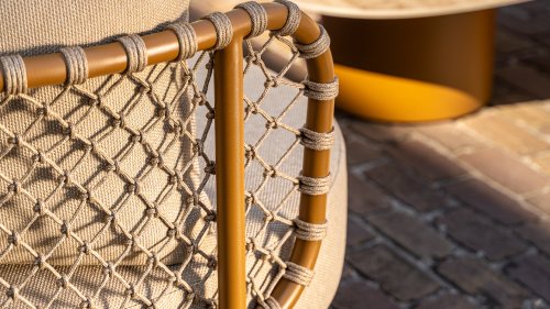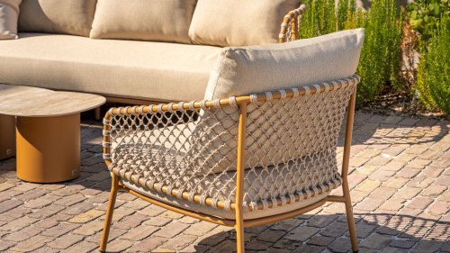 Das offen gewebte Seildesign in warmen Bernsteintönen verleiht der Martinique Lounge einen luftigen, modernen Look. Die abgerundeten Ecken der Elemente und die tiefen, weichen Kissen laden zum stilvollen Entspannen ein. Die natürliche, sandfarbene Polsterung passt perfekt zu einer ruhigen, harmonischen Outdoor-Umgebung.