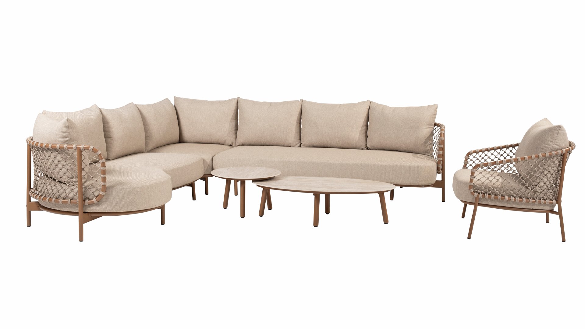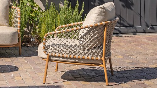 Erleben Sie zeitlosen Luxus mit der Martinique Loungegruppe von 4 Seasons Outdoor. Das auffällige geknotete Rope-Design verleiht einen spielerischen, aber raffinierten Charakter, während der bernsteinfarbene Rahmen Wärme und Ambiente in Ihren Garten oder Ihre Terrasse bringt. Dieses Set ist perfekt für alle, die eine Kombination aus Stil und Komfort suchen.
