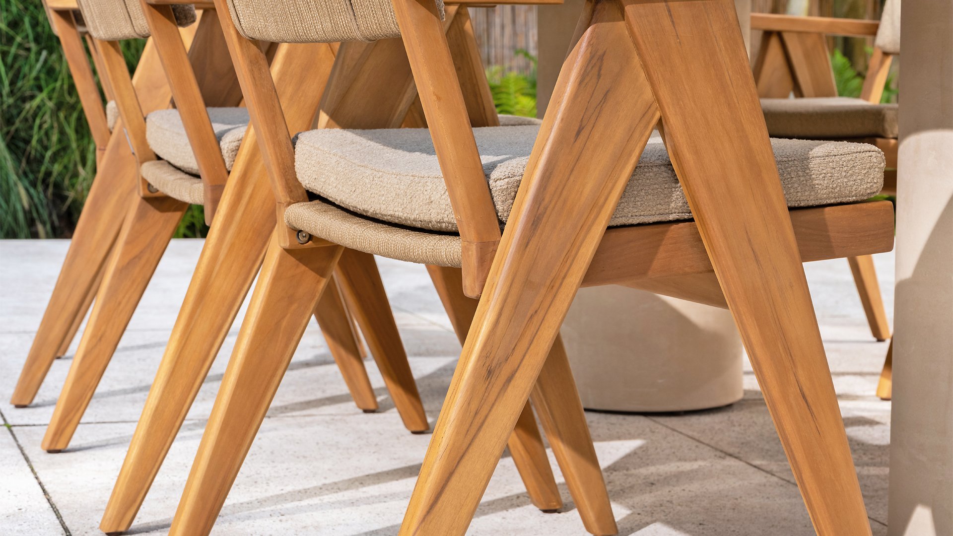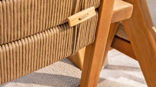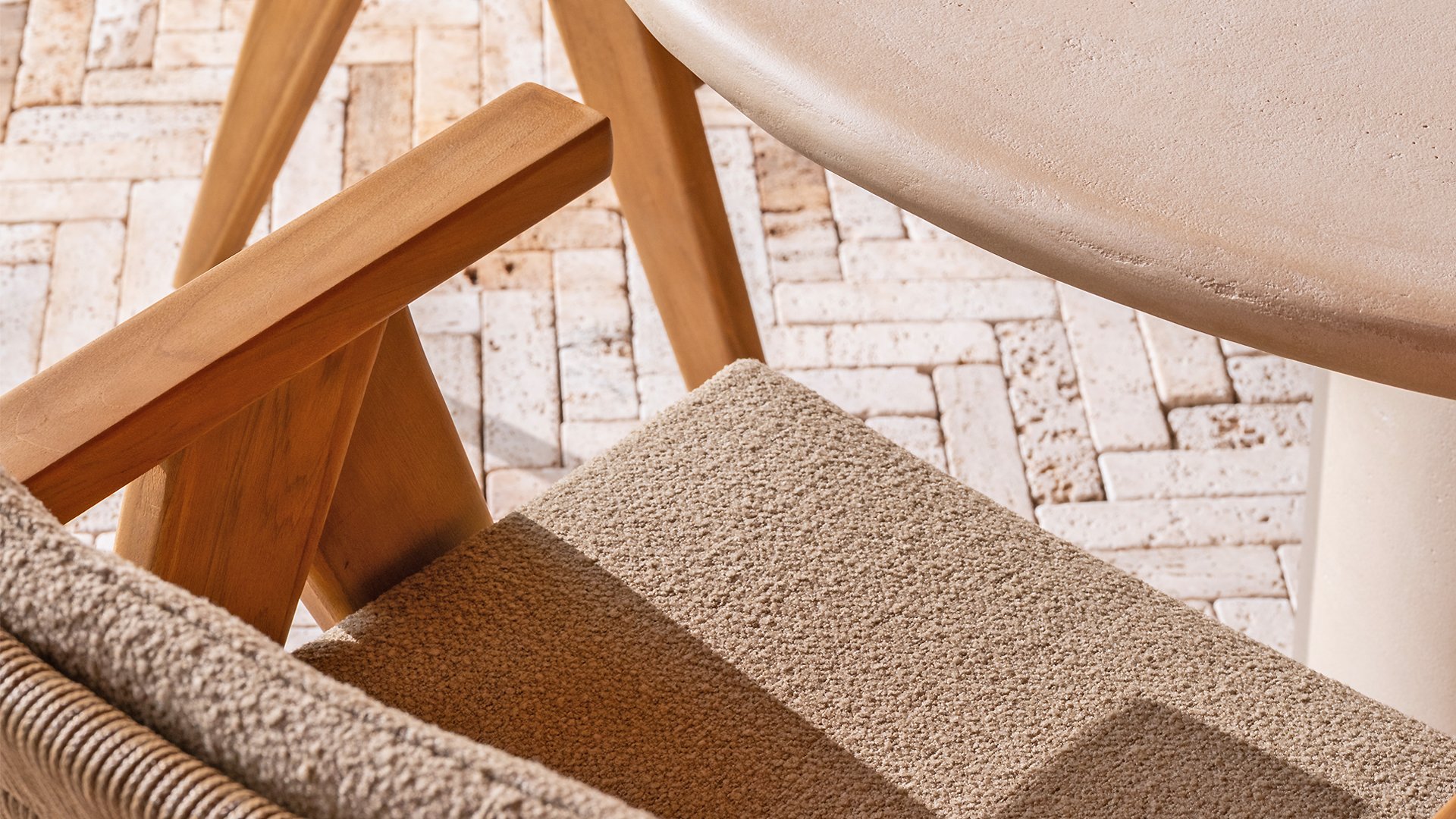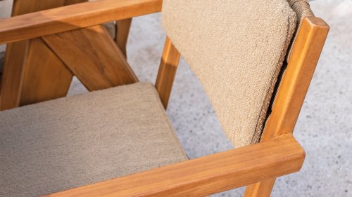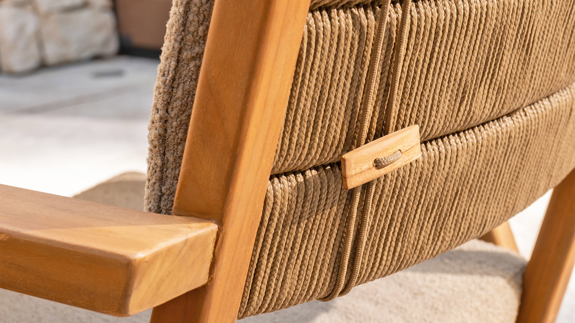 • Stilvolles und zeitloses Design: Die Kombination aus Teakholz und taupefarbenem Bouclé schafft in jedem Garten eine elegante, beruhigende Atmosphäre.