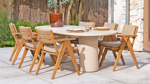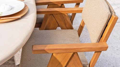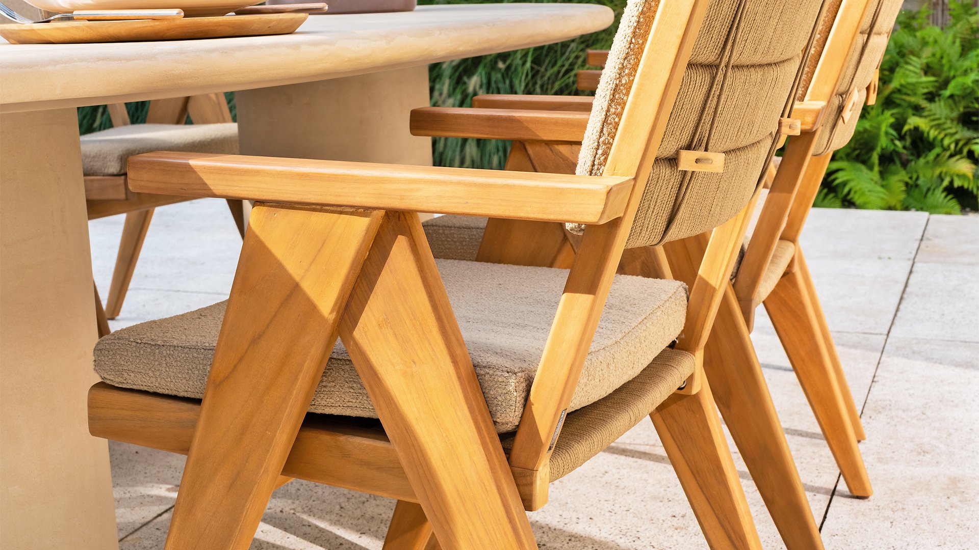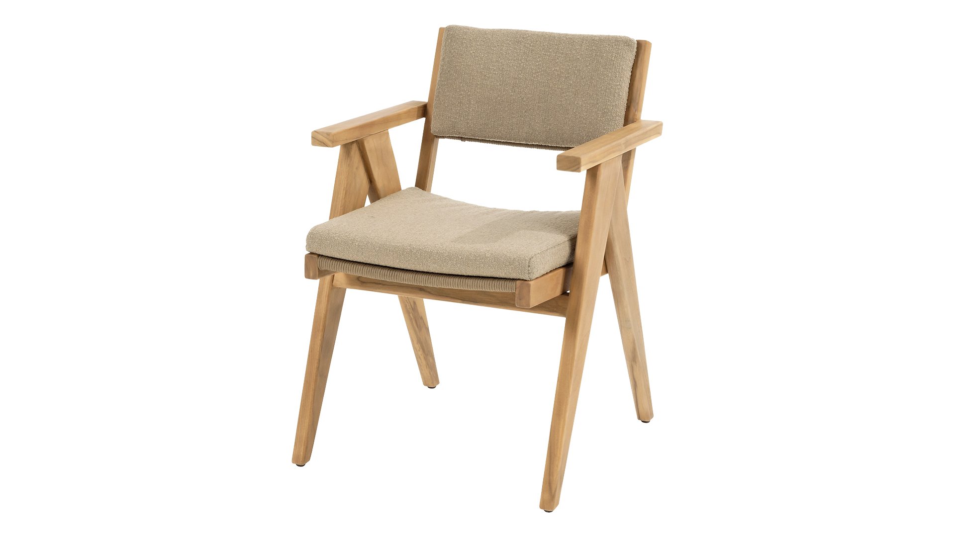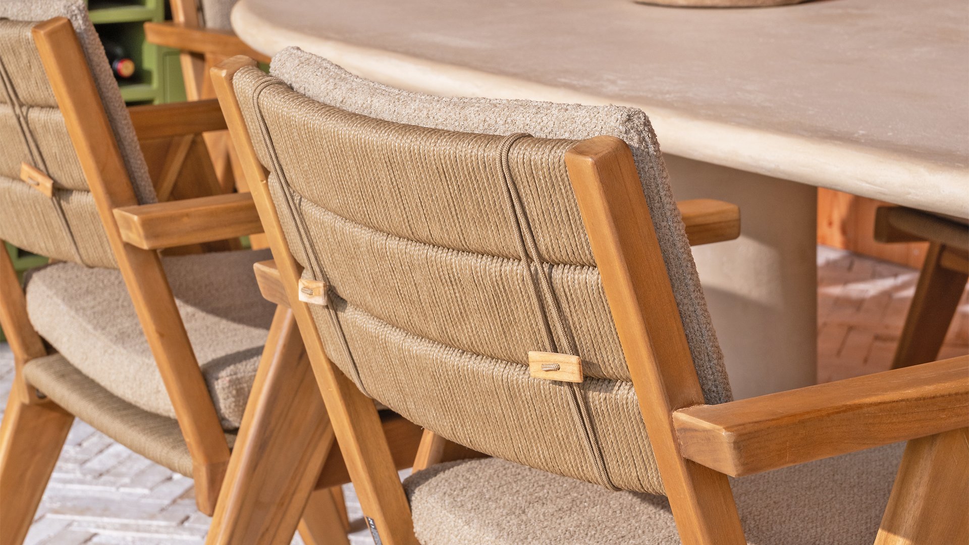 • Stilvolles und zeitloses Design: Die Kombination aus Teakholz und taupefarbenem Bouclé schafft in jedem Garten eine elegante, beruhigende Atmosphäre.