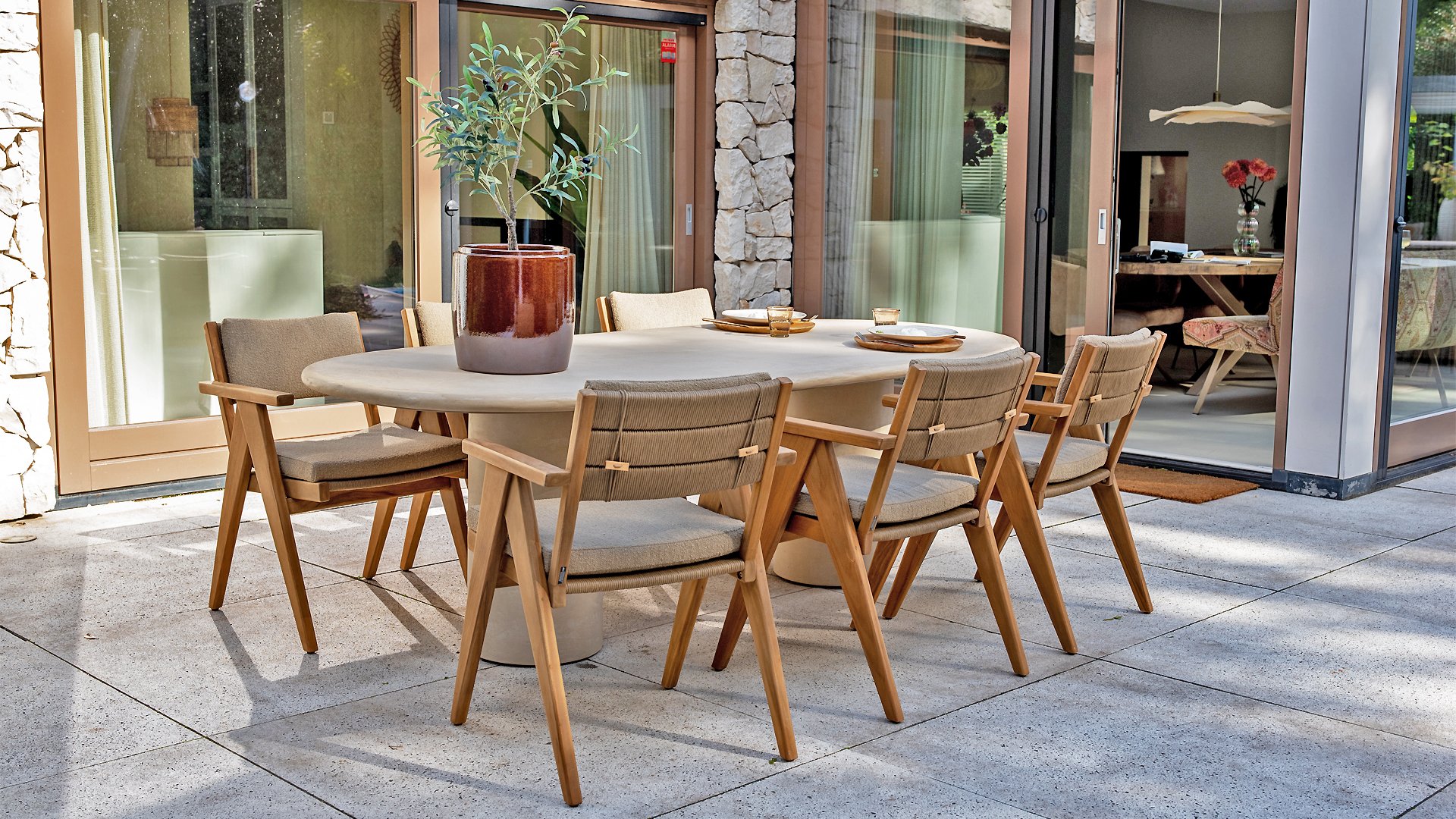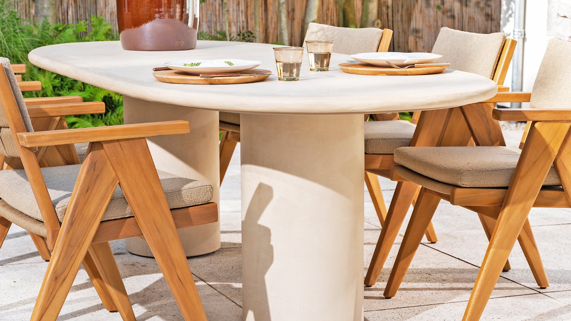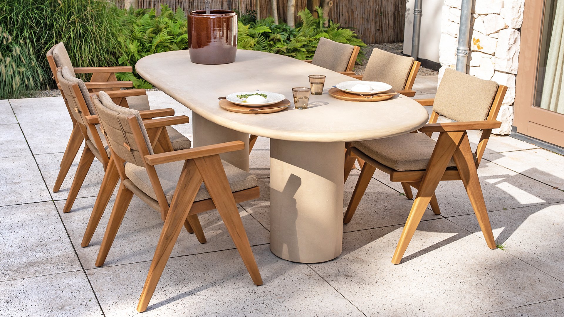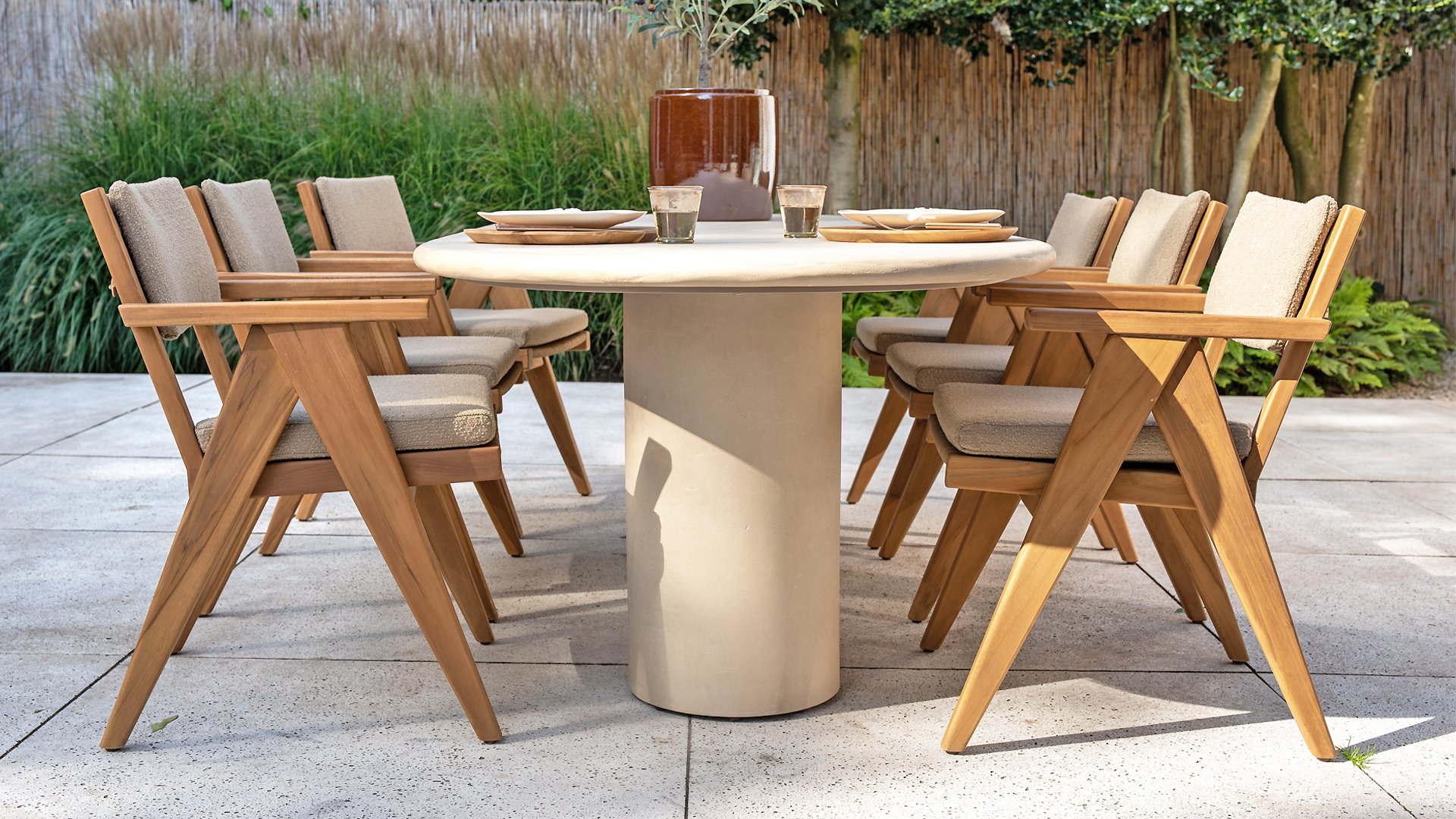 • Stilvolles und zeitloses Design: Die Kombination aus Teakholz und taupefarbenem Bouclé schafft in jedem Garten eine elegante, beruhigende Atmosphäre.