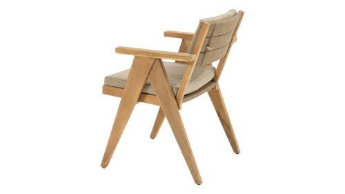 Das Stuhlkissen besteht aus Olefin und ist mit Bouclé Amber gewebt, was für zusätzliche Eleganz sorgt. Das braune Kissen verleiht einen beruhigenden, neutralen Ton, der die natürliche Optik des Teakholzrahmens ergänzt. Das Kissen ist an vier Punkten am Teakholzrahmen befestigt.