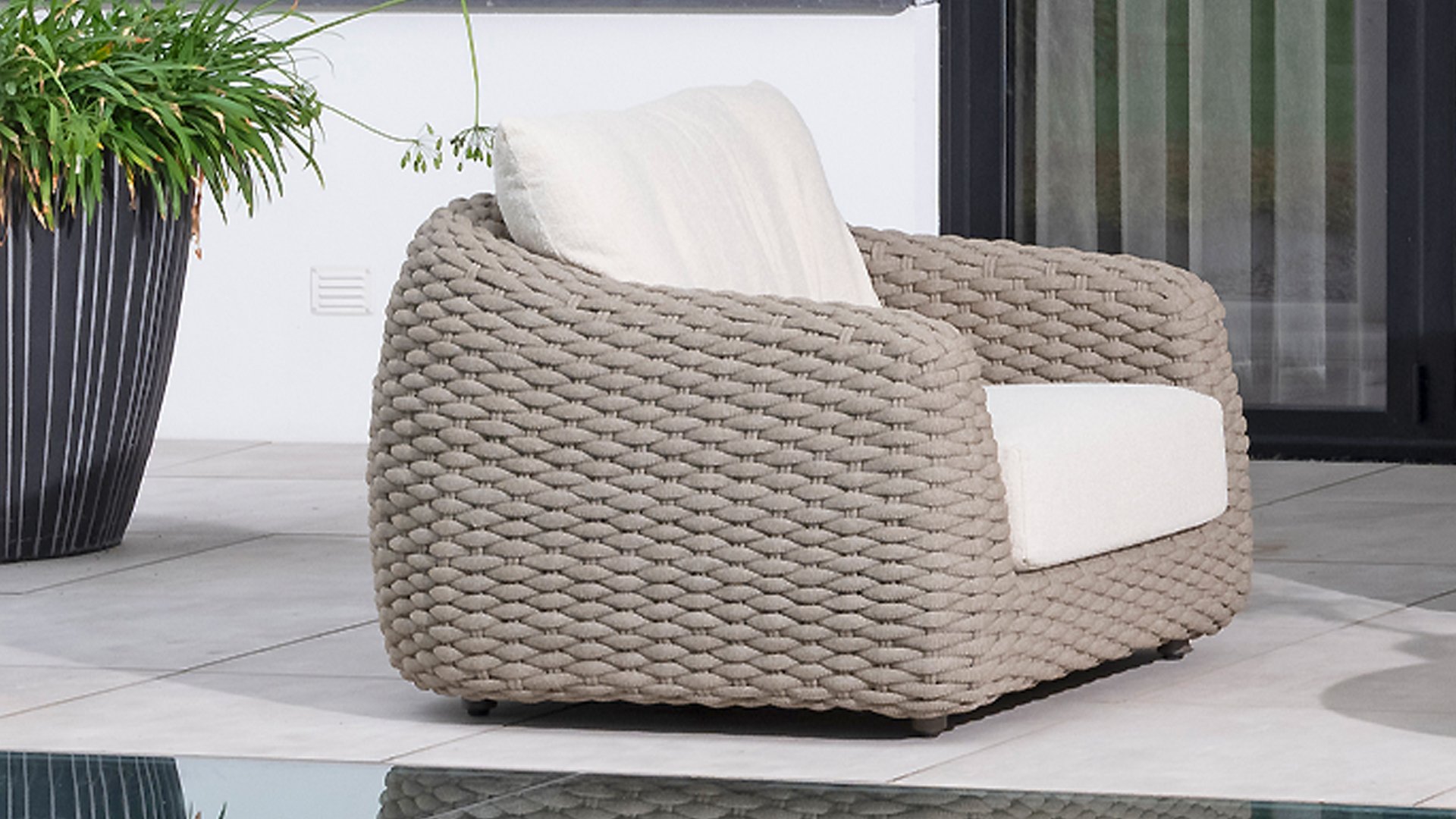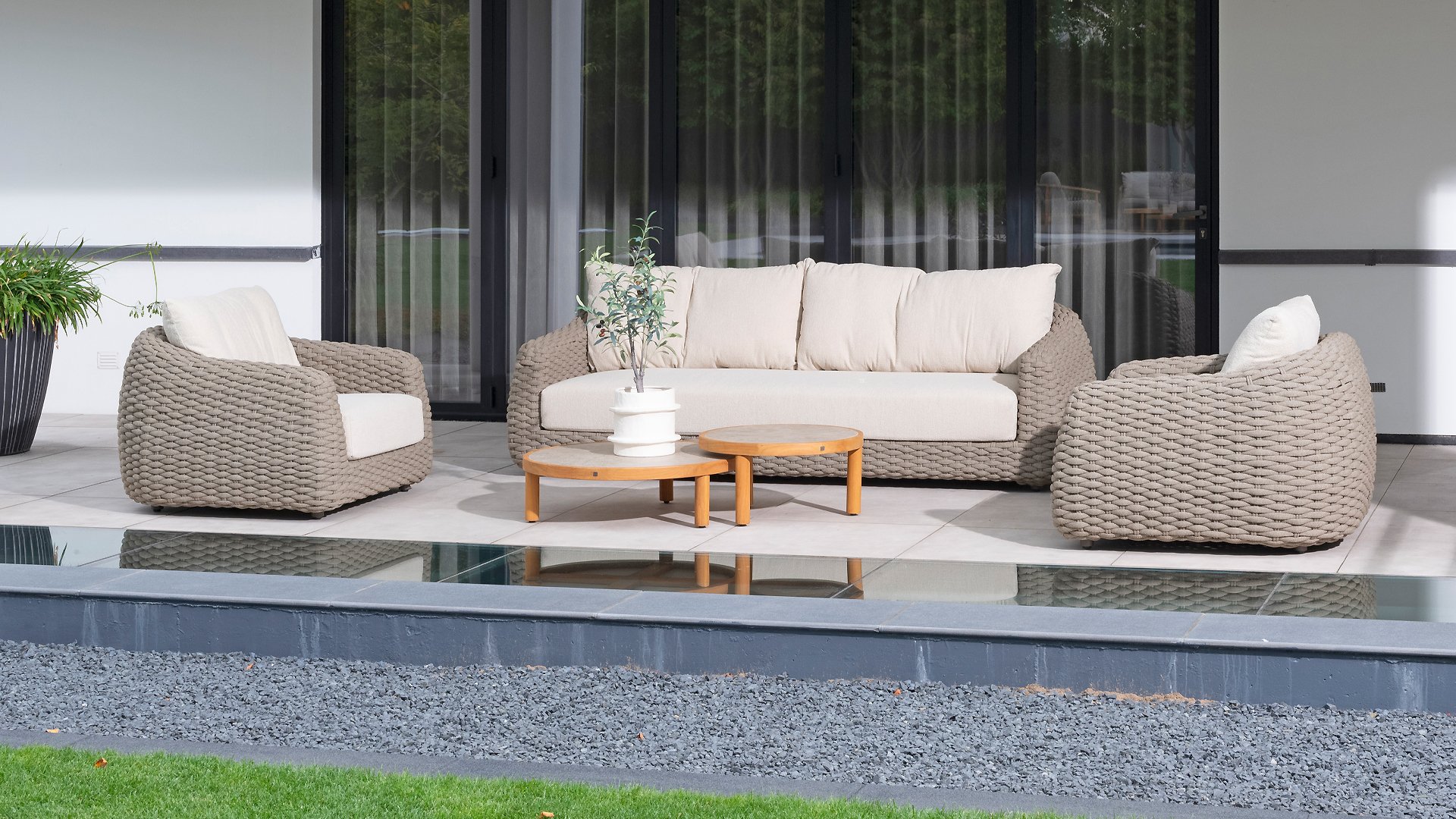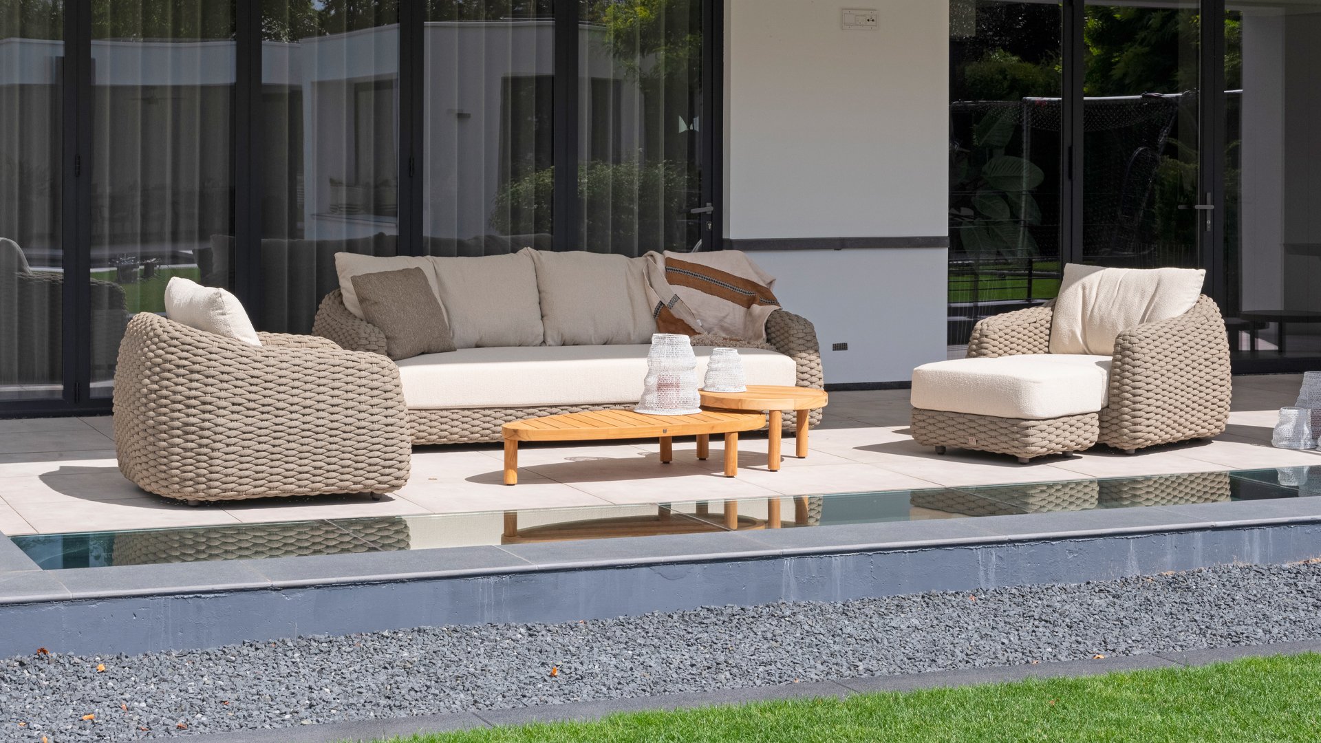 Ich liebe Maxime. Mit Maxime richten Sie Ihre luxuriöse Terrasse wunderschön ein, denn diese vollständig gewebte, üppige Loungeserie ist ein Augenschmaus mit ihrem wunderschönen organischen Design. Die dicken Loungekissen aus cremefarbenem Bouclé-Stoff sorgen für totale Entspannung. Wählen Sie Ihre ideale Konfiguration und genießen Sie Ihren luxuriösen Garten.