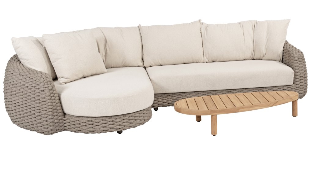 Verbessern Sie Ihr Lounge-Erlebnis mit der Maxime-Lounge von 4 Seasons Outdoor. Dieses Lounge-Set ist eine perfekte Ergänzung für Ihre luxuriöse Terrasse. Die schönen Kurven sind eine Augenweide, während die dicken Loungekissen aus cremefarbenem Bouclé-Stoff für absolute Entspannung sorgen.