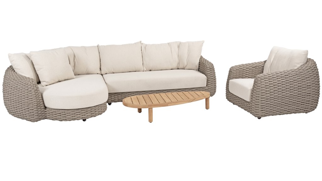 Verbessern Sie Ihr Lounge-Erlebnis mit der Maxime-Lounge von 4 Seasons Outdoor. Dieses Lounge-Set ist eine perfekte Ergänzung für Ihre luxuriöse Terrasse. Die schönen Kurven sind eine Augenweide, während die dicken Loungekissen aus cremefarbenem Bouclé-Stoff für absolute Entspannung sorgen.