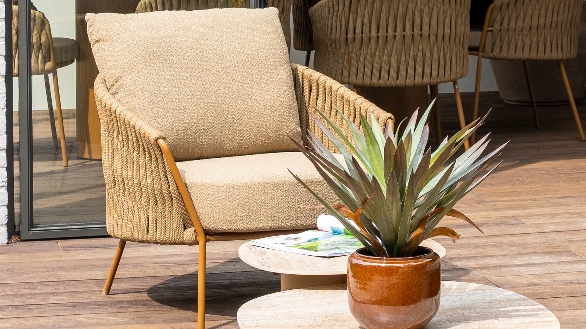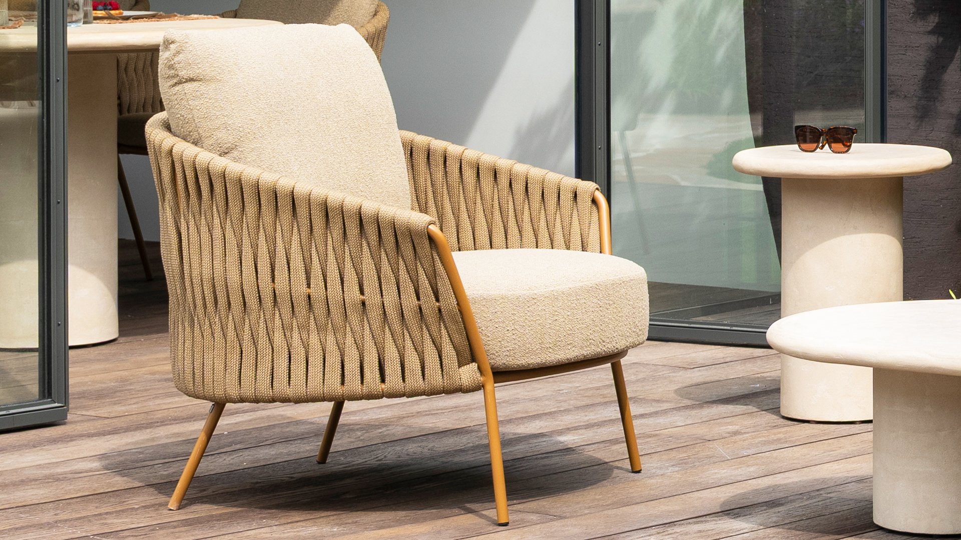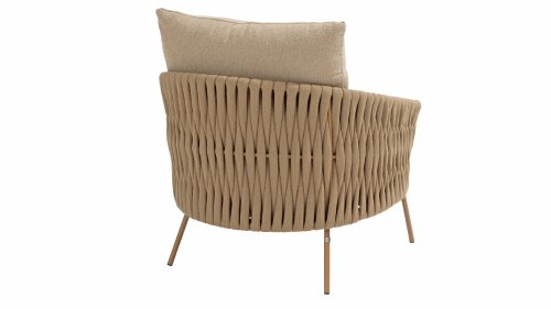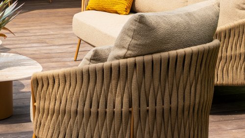 Der Rahmen besteht aus pulverbeschichtetem Edelstahl in einem warmen, erdigen Bernsteinton, kombiniert mit einem auffallend dicken Seilgeflecht. Diese handwerkliche Verarbeitung verleiht der Amber-Serie ein robustes und zugleich edles Aussehen. Die wetterbeständigen Olefin-Kissenbezüge sind UV- und schimmelresistent – ideal für jahrelangen Einsatz im Freien. Die Stuhlschale bietet bequeme Rücken- und Armstütze.