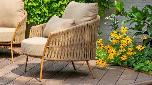 Die 4 Seasons Outdoor Molina Amber Loungegruppe ist die perfekte Wahl für jeden Außenbereich. Mit ihrem dick geflochtenen braunen Seil und den üppig gefüllten Kissen aus weichem, bernsteinfarbenem Bouclé lädt diese Garnitur zum Entspannen in Ihrem Garten oder auf Ihrer Terrasse ein.