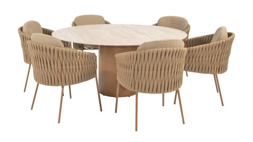 - Erhältlich in stilvollen Farbvarianten: Die Kombination aus dem warmen, bernsteinfarbenen Gestell und dem eleganten, braun getönten, handgeflochtenen Seil (Rope) sorgt für einen zeitgemäßen und dennoch warmen Look, der in jeden Garten passt.