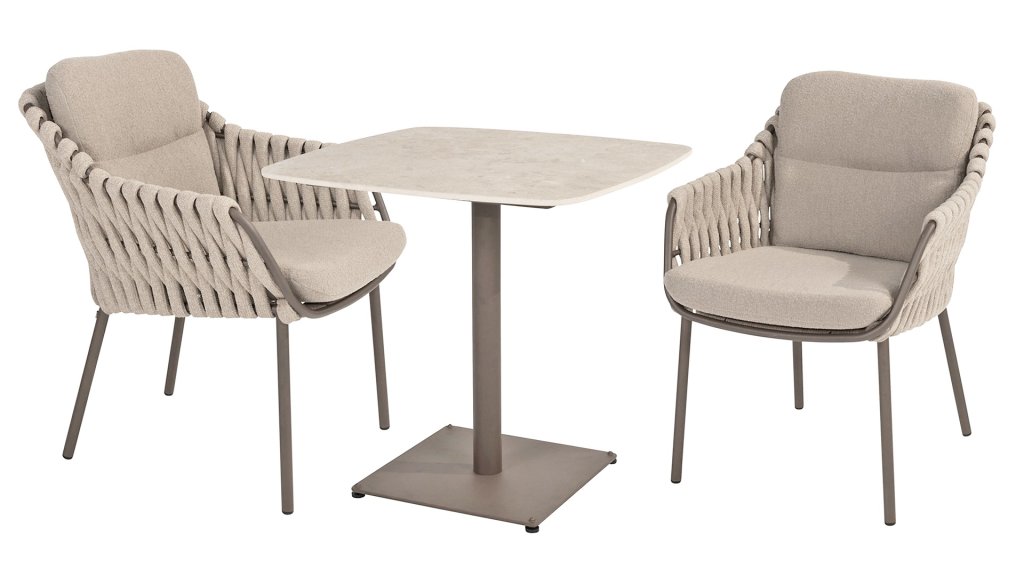 Lernen Sie das 4 Seasons Outdoor Montera Dining kennen. Hergestellt mit einem Edelstahlrahmen in der Farbe Terre. Der Seilfaden sowie die Kissen sind in der Farbe Clay gehalten, die Polsterung der Kissen ist zur Abwechslung einmal Boucle! So sieht es nicht nur schick aus, sondern auch schön, trendig und verspielt.