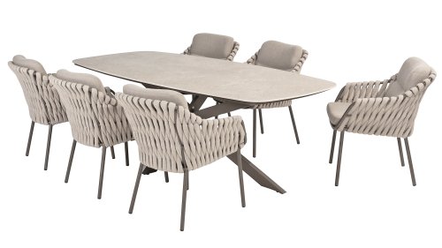 Lernen Sie das 4 Seasons Outdoor Montera Dining kennen. Hergestellt mit einem Edelstahlrahmen in der Farbe Terre. Der Seilfaden sowie die Kissen sind in der Farbe Clay gehalten, die Polsterung der Kissen ist zur Abwechslung einmal Boucle! So sieht es nicht nur schick aus, sondern auch schön, trendig und verspielt.