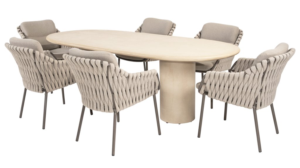 Lernen Sie das 4 Seasons Outdoor Montera Dining kennen. Hergestellt mit einem Edelstahlrahmen in der Farbe Terre. Der Seilfaden sowie die Kissen sind in der Farbe Clay gehalten, die Polsterung der Kissen ist zur Abwechslung einmal Boucle! So sieht es nicht nur schick aus, sondern auch schön, trendig und verspielt.