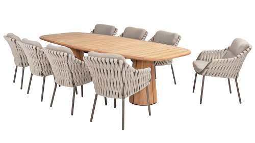 Lernen Sie das 4 Seasons Outdoor Montera Dining kennen. Hergestellt mit einem Edelstahlrahmen in der Farbe Terre. Der Seilfaden sowie die Kissen sind in der Farbe Clay gehalten, die Polsterung der Kissen ist zur Abwechslung einmal Boucle! So sieht es nicht nur schick aus, sondern auch schön, trendig und verspielt.