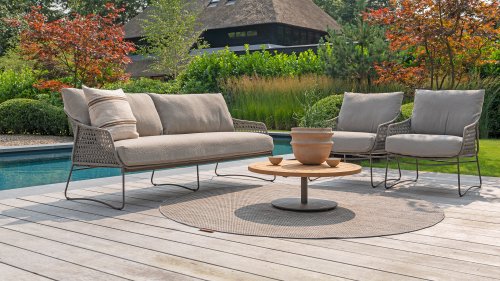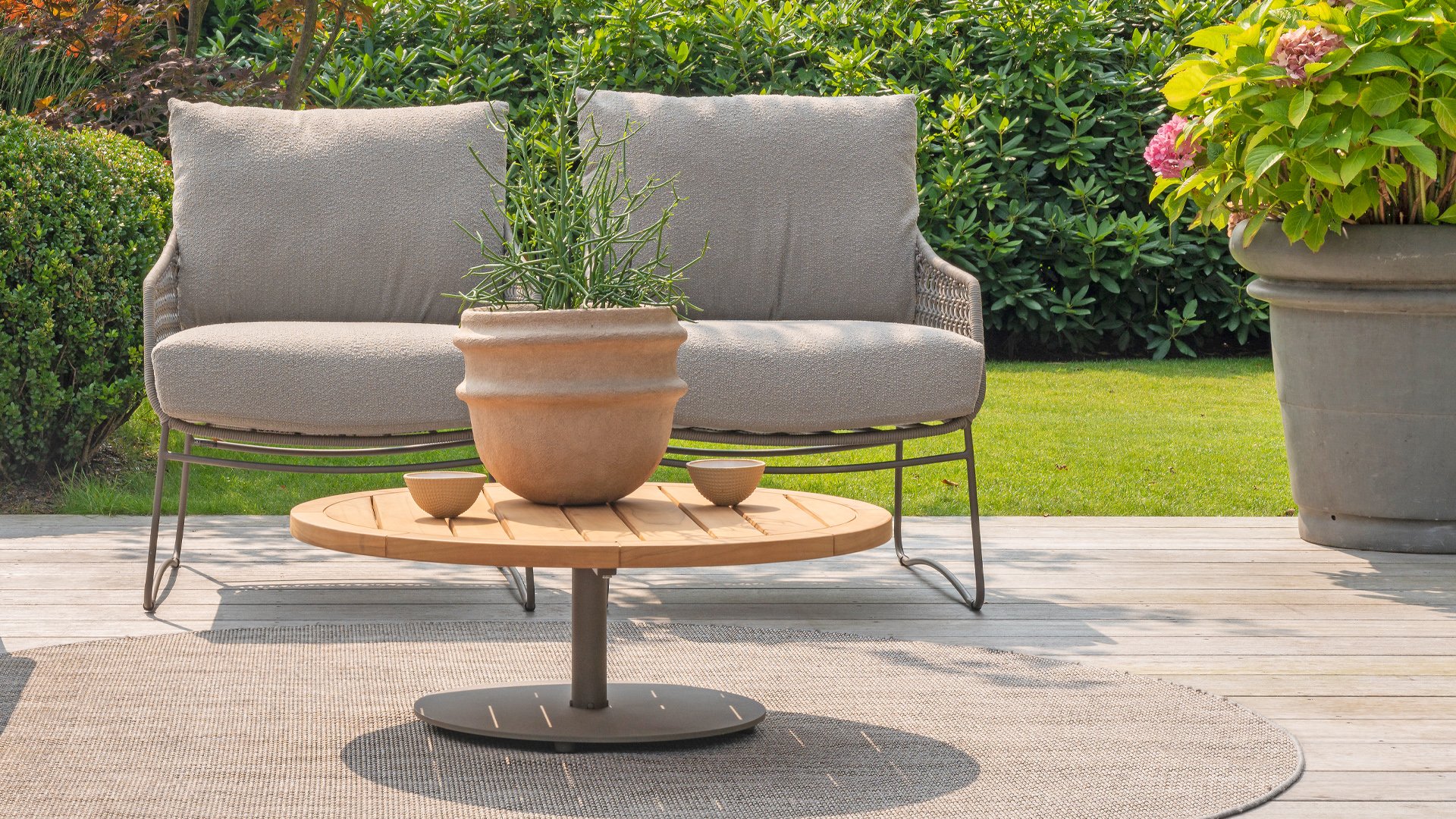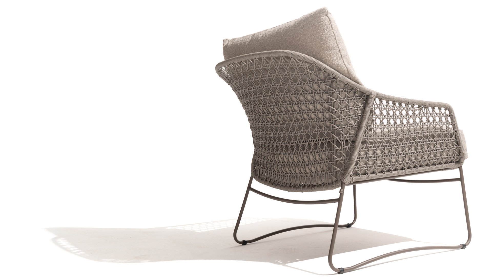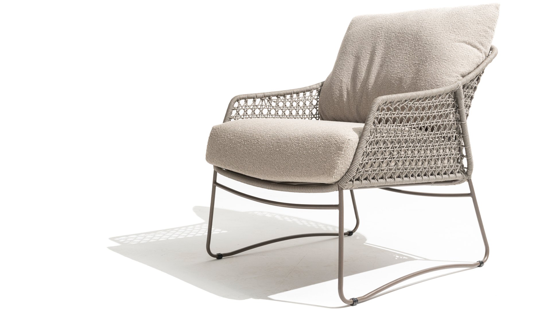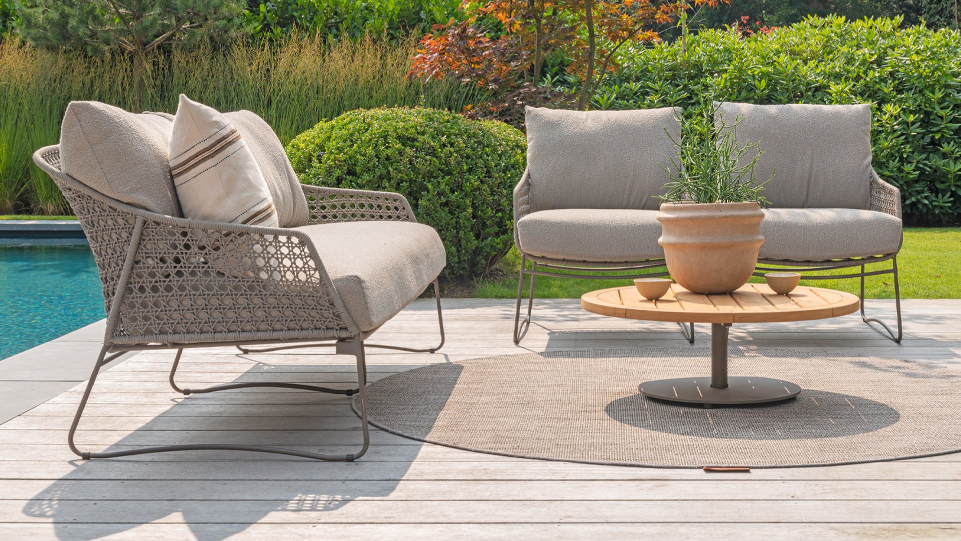 4 Seasons Moretti Lounge: Lassen Sie sich vom raffinierten Design der Moretti-Lounge überraschen. Die eleganten Rundungen des Rahmens und das kunstvolle Seilgeflecht sorgen für einen zeitlosen Look, der perfekt in jeden Garten passt. Genießen Sie höchsten Komfort mit den dicken Kissen aus weichem Bouclé-Stoff, die zum Entspannen bis in die späten Morgenstunden einladen.