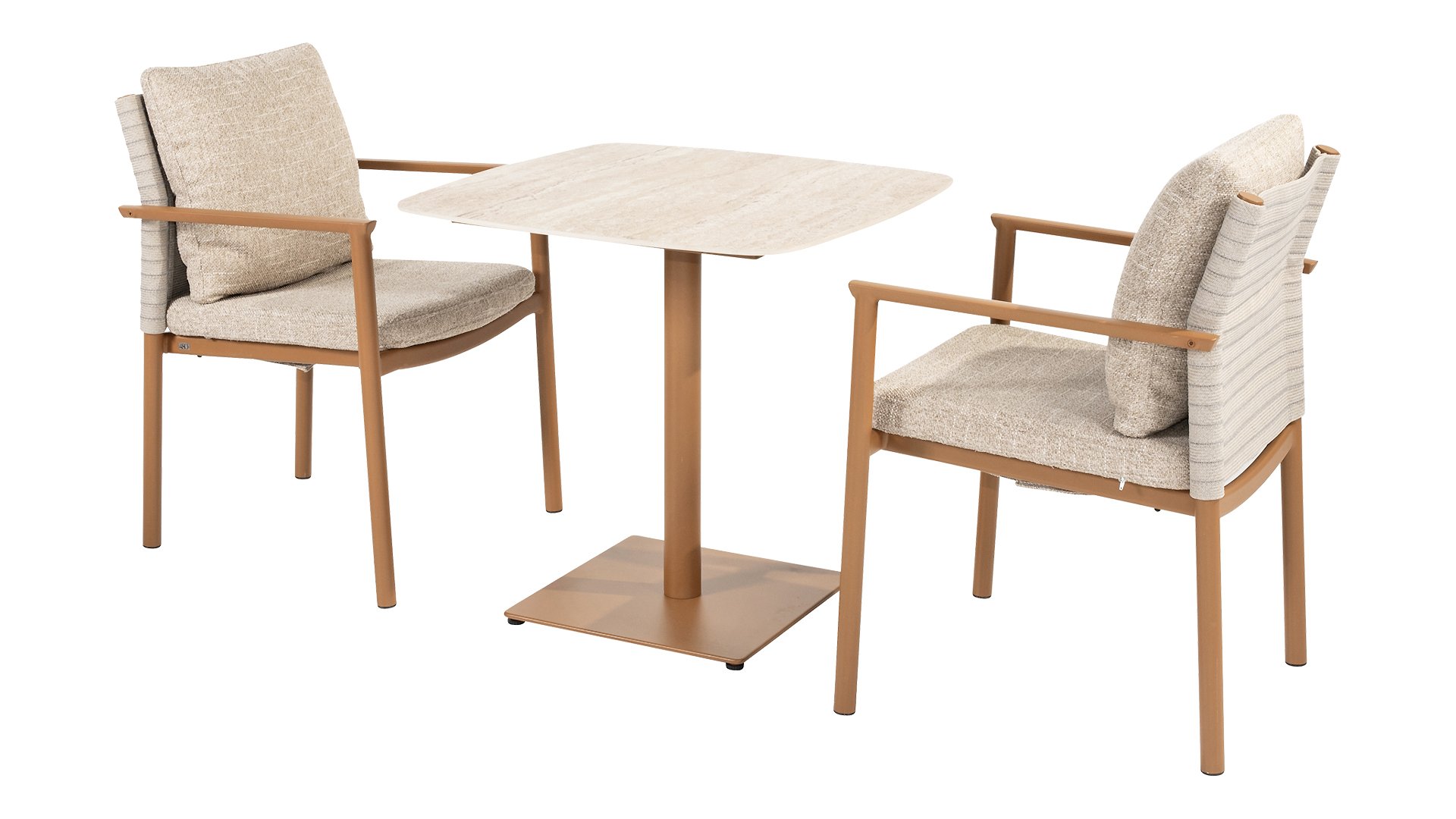 Dieser Tisch mit einer Größe von 75x75 cm verfügt über eine elegante Keramikplatte, die sowohl stilvoll als auch praktisch ist. Die Keramik ist nicht nur langlebig und leicht zu reinigen, sondern verleiht auch ein luxuriöses Aussehen. Das Gestell ist in einem warmen, erdigen Farbton namens amber gehalten, der perfekt zu modernen und rustikalen Innenräumen/Gärten passt.