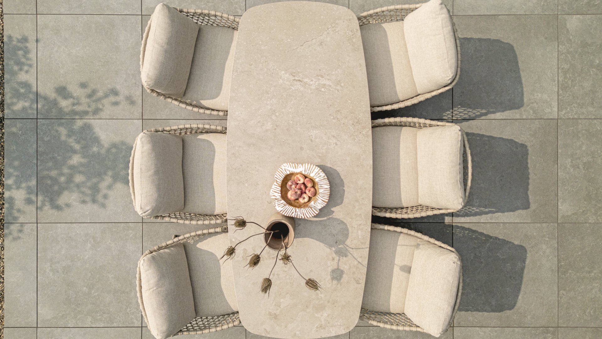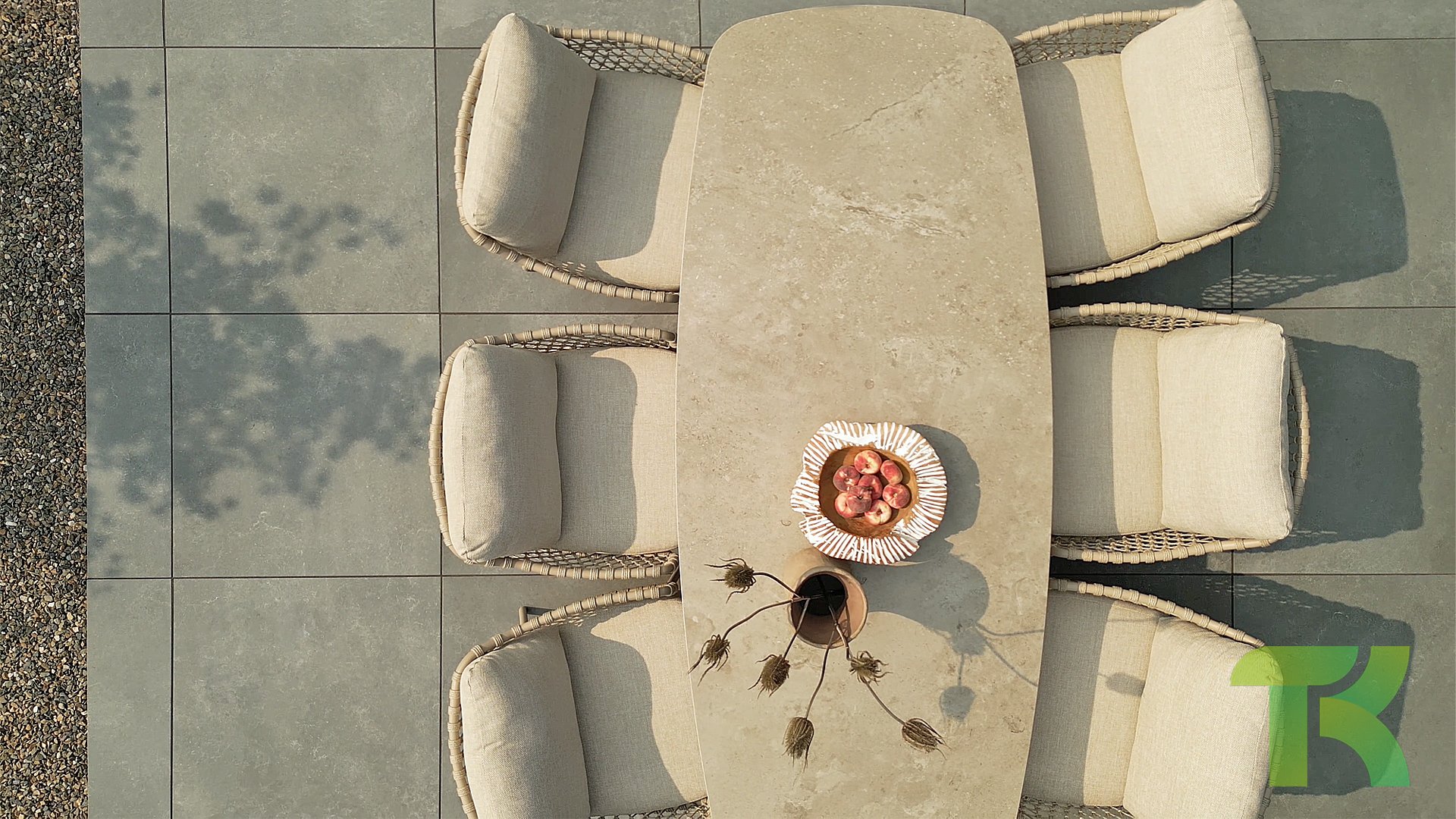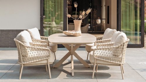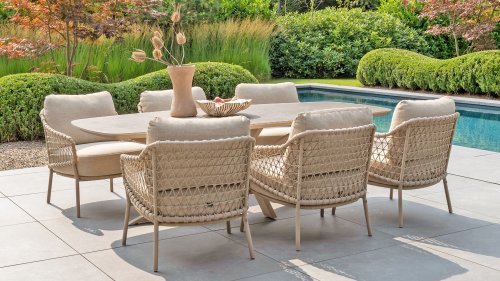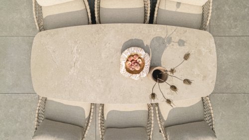 Der Nevada-Tisch ist ein wunderschöner niedriger Esstisch, der sich perfekt für das Leben im Freien eignet. Mit seiner falsch ovalen (fassförmigen) Keramikplatte und der Basis in sanfter Latte-Farbe strahlt er Wärme und Gemütlichkeit aus. Die Keramik eignet sich ideal für den Außenbereich: Sie ist langlebig, schmutzabweisend und leicht zu reinigen. Die Basis des Tisches bildet ein modernes Kreuzbein, das nicht nur für Stabilität sorgt, sondern auch ein zeitgemäßes Aussehen verleiht. Dieses Design bietet viel Platz für bequeme Sitzgelegenheiten und erleichtert das Entspannen bei einer informellen Mahlzeit oder einem Drink mit Freunden und der Familie. Die geringe Höhe des niedrigen Esstisches Nevada schafft eine ungezwungene, entspannte Atmosphäre, die sich perfekt für lange Sommerabende im Garten oder auf der Terrasse eignet. Mit seiner eleganten Form und natürlichen Farbe ist der Nevada-Tisch eine schöne Ergänzung für jeden Außenbereich, ideal, um das Leben draußen gemeinsam zu genießen!