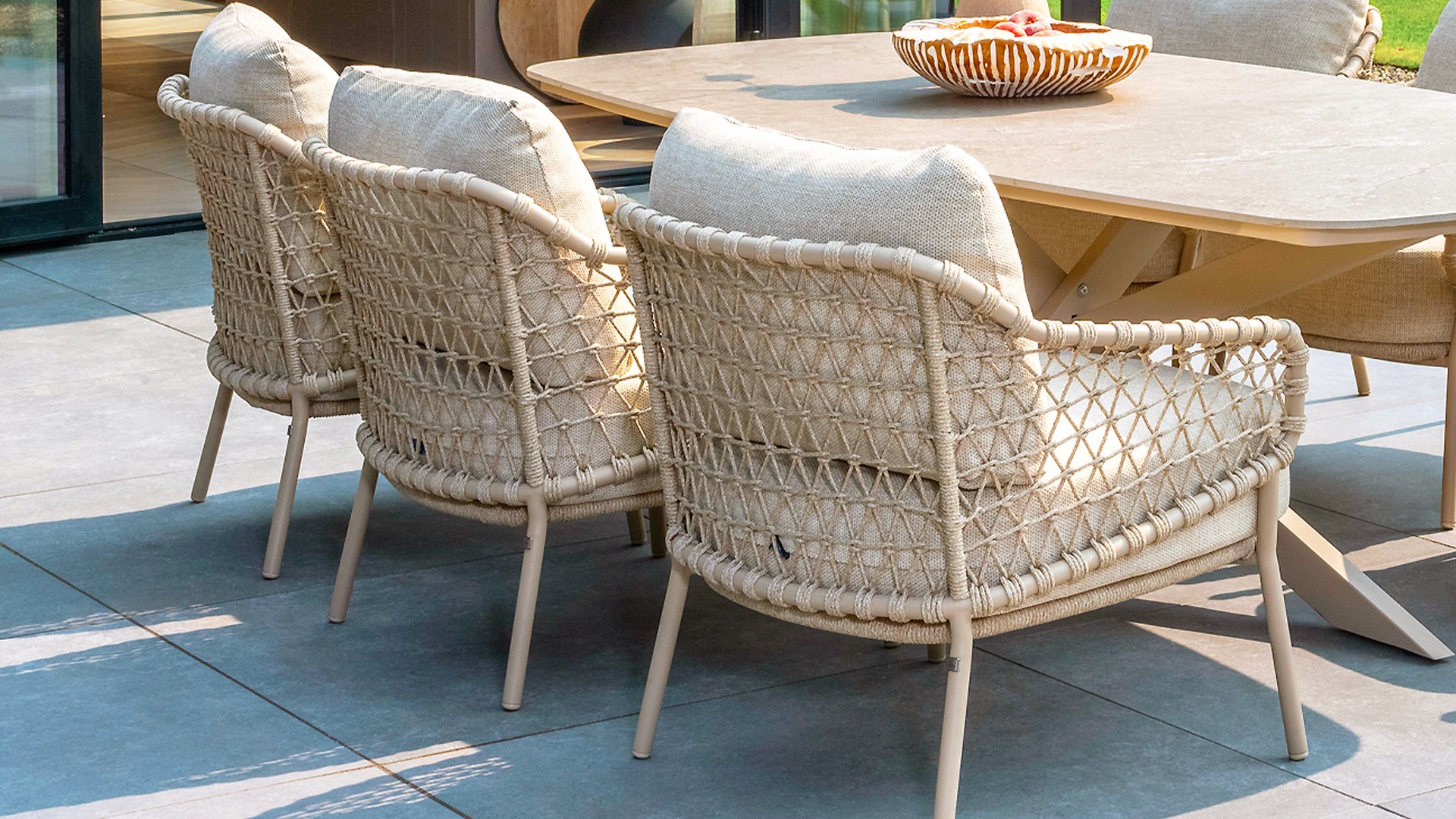 - Natürliches Aussehen: Die Latte-Seilpolsterung verleiht dem Stuhl ein natürliches, warmes und freundliches Aussehen, perfekt für eine entspannte Umgebung im Freien.