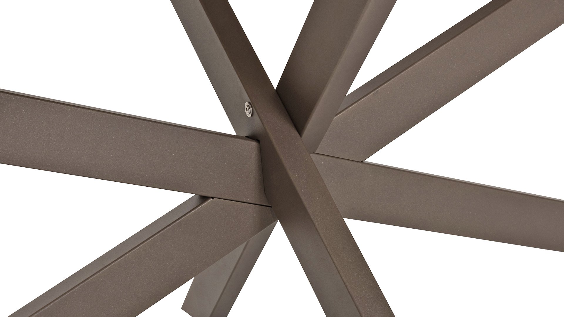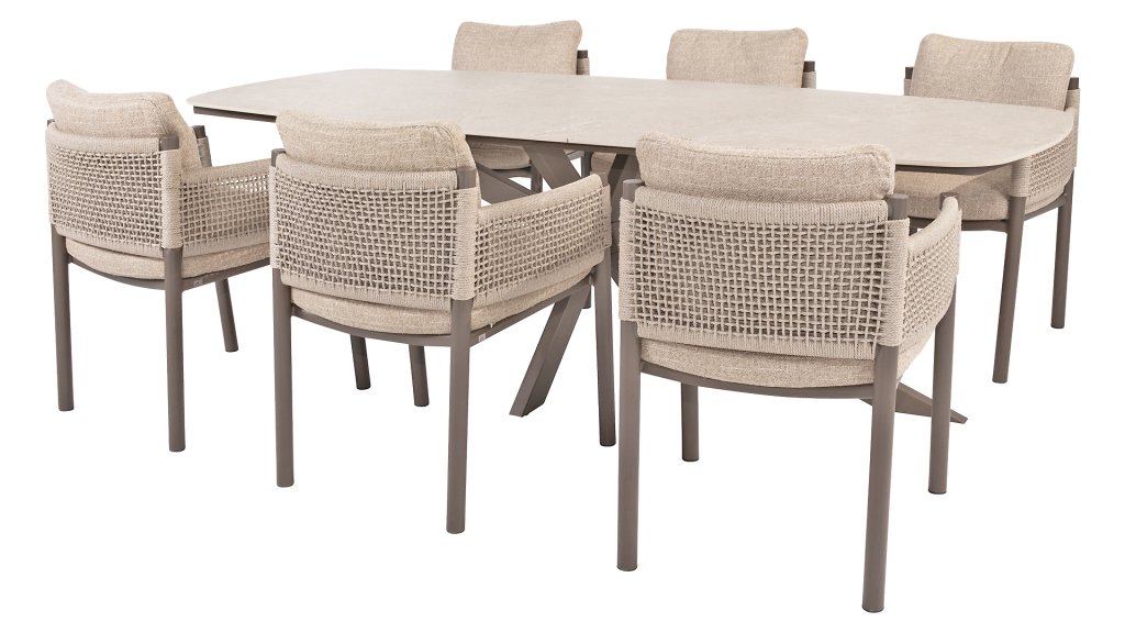 Ein wunderschöner, eleganter Tisch mit einer atemberaubenden ovalen Keramikplatte, erhältlich in 240 cm oder 300 cm. Die Platte strahlt nicht nur Eleganz aus, sondern besticht auch durch ihr markantes, modernes Aussehen. Das markante Kreuzbein ist in drei Farben erhältlich, sodass Sie diesen Tisch mühelos an Ihre Bedürfnisse und Vorlieben anpassen können. Ob Industrieschwarz, warmes Latte oder schickes Terre – jede Farbe verleiht dem Tisch einen einzigartigen Charakter und einen Hauch von Luxus. Mit seinen großzügigen Abmessungen bietet dieser Tisch ausreichend Platz für ein gemütliches Essen mit Freunden oder ein intimes Abendessen mit der Familie. Die Kombination aus raffinierter Keramik und dem starken, stilvollen Bein macht diesen Tisch nicht nur funktional, sondern setzt auch ein atemberaubendes Statement in Ihrem Garten.