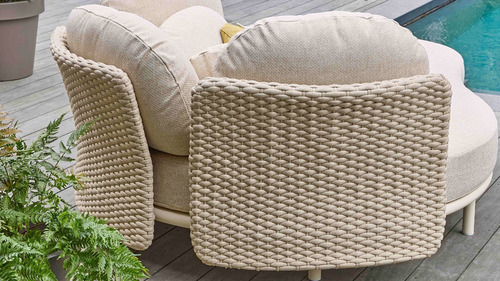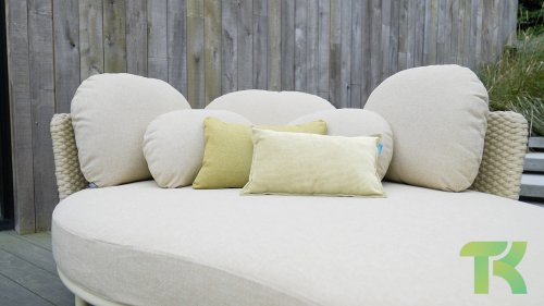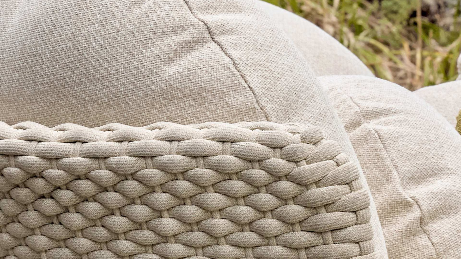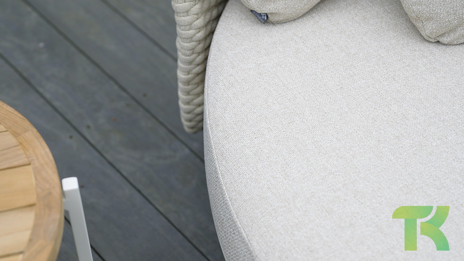 Das Daybed ist in zwei Farben erhältlich: Taupe und Oyster, beides neutrale Töne, die sich leicht mit verschiedenen Gartenstilen und -farben kombinieren lassen. Die Rückenteile sind mit Seilgewebe-Paneelen versehen, einem Material, das sowohl langlebig als auch atmungsaktiv ist. Die Kissen des Chill Out Daybeds haben die Farbe Smoked Grey, einen subtilen, hellgrauen Ton, der eine luxuriöse und raffinierte Atmosphäre ausstrahlt. Die Kissen bestehen aus Olefin, einem Material, das für seine ausgezeichnete Widerstandsfähigkeit gegen Witterungseinflüsse sowie seinen hohen Komfort und seine Langlebigkeit bekannt ist, ideal für den Außenbereich.