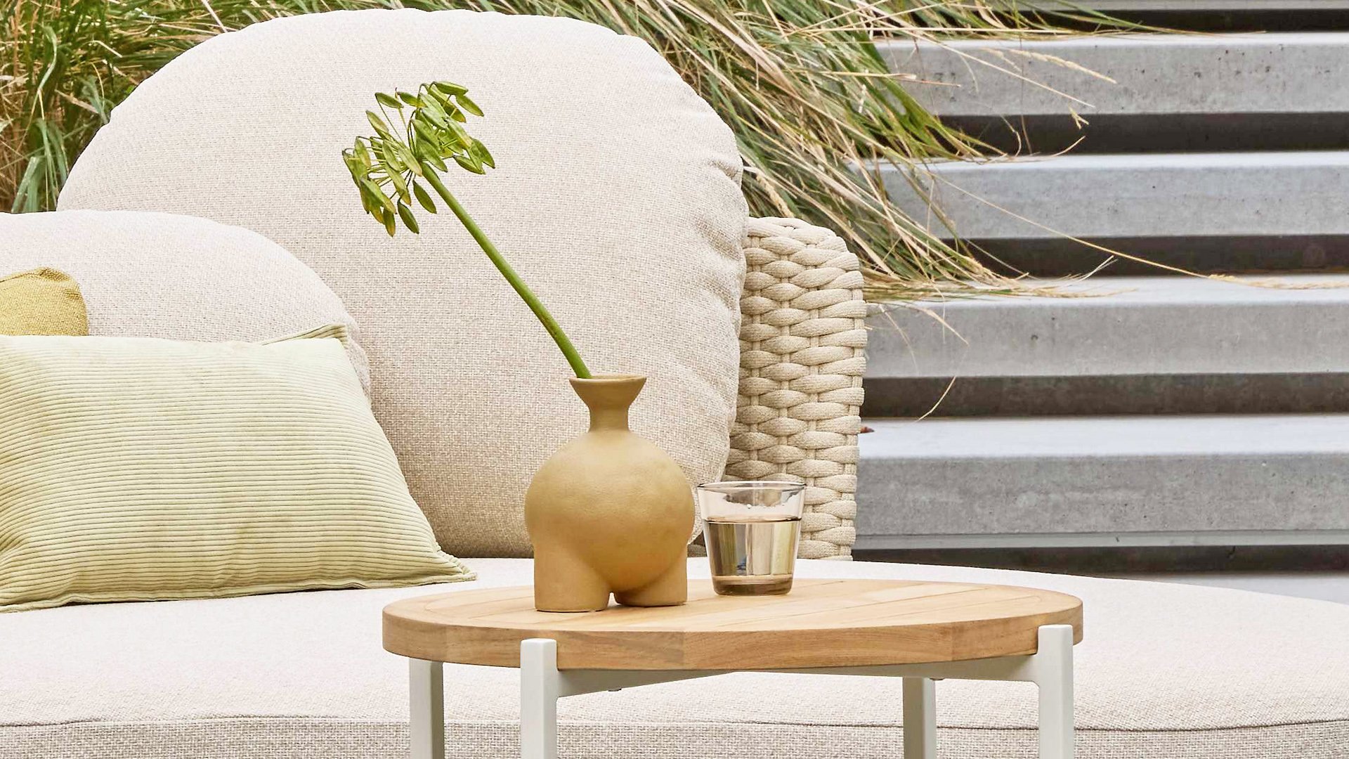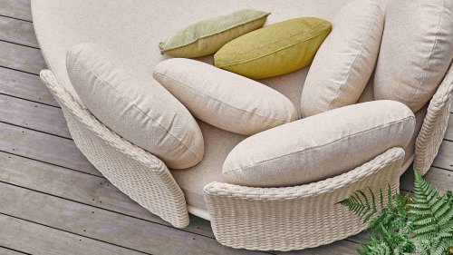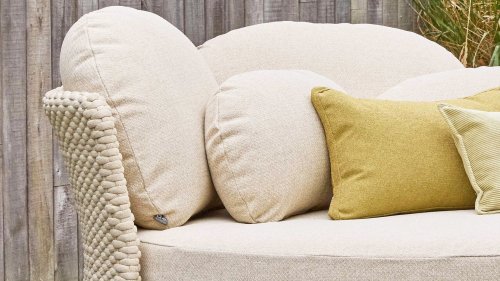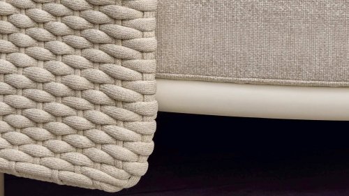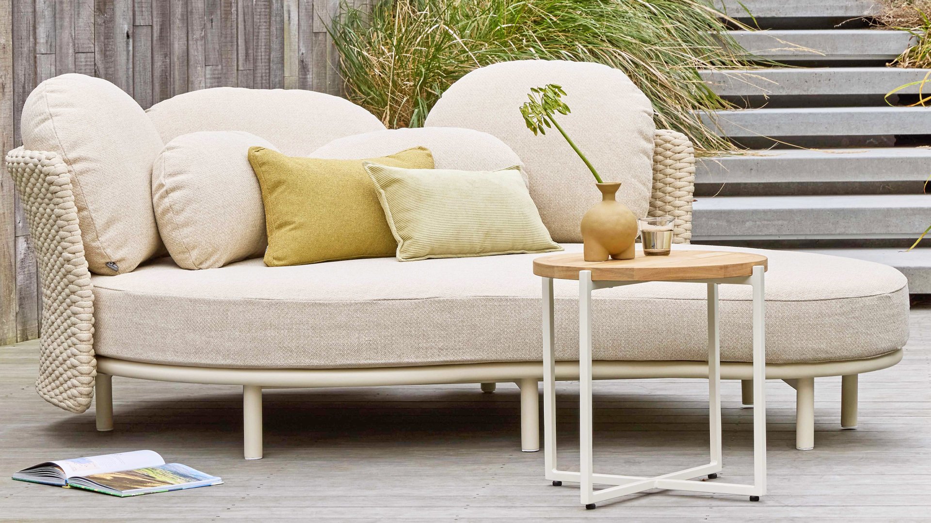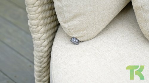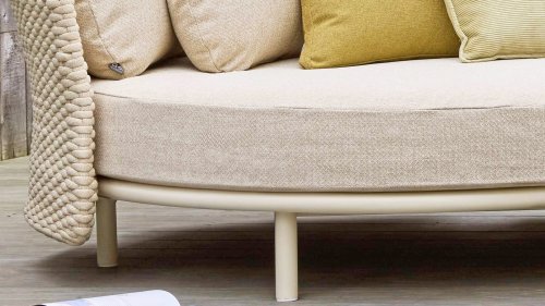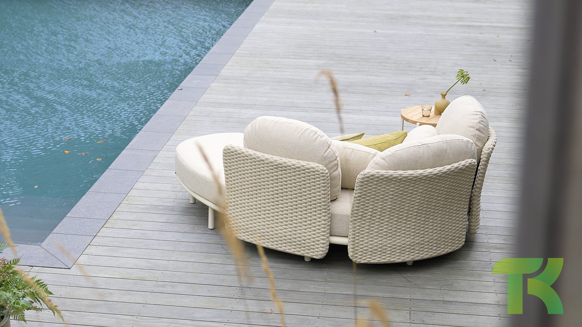 Das Daybed ist in zwei Farben erhältlich: Taupe und Oyster, beides neutrale Töne, die sich leicht mit verschiedenen Gartenstilen und -farben kombinieren lassen. Die Rückenteile sind mit Seilgewebe-Paneelen versehen, einem Material, das sowohl langlebig als auch atmungsaktiv ist. Die Kissen des Chill Out Daybeds haben die Farbe Smoked Grey, einen subtilen, hellgrauen Ton, der eine luxuriöse und raffinierte Atmosphäre ausstrahlt. Die Kissen bestehen aus Olefin, einem Material, das für seine ausgezeichnete Widerstandsfähigkeit gegen Witterungseinflüsse sowie seinen hohen Komfort und seine Langlebigkeit bekannt ist, ideal für den Außenbereich.